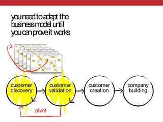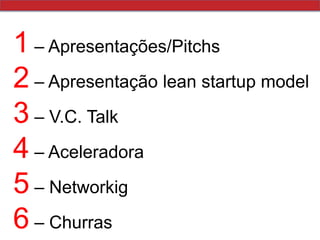 1. O documento discute conceitos fundamentais sobre startups, incluindo o que é uma startup, metodologia Lean Startup, validação do modelo de negócios e falhas comuns. 2. É mencionado que startups operam sob extrema incerteza buscando um modelo de negócios escalável e repetitivo. 3. A metodologia Lean Startup enfatiza desenvolvimento ágil, customer development e software como commodity para validar hipóteses com clientes de forma rápida.