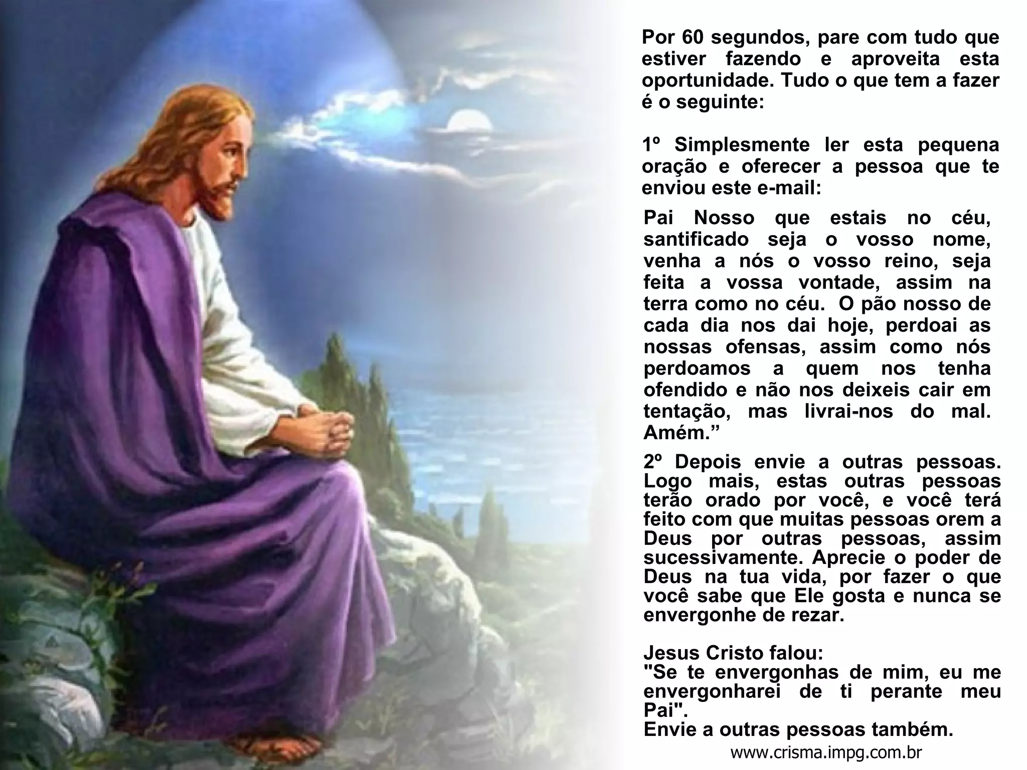 O documento pede que o leitor pare por 60 segundos para ler e rezar o Pai Nosso, e então envie para outras pessoas, de modo que muitos possam orar uns pelos outros, e aproveitar o poder de Deus na vida, sem se envergonhar de rezar.