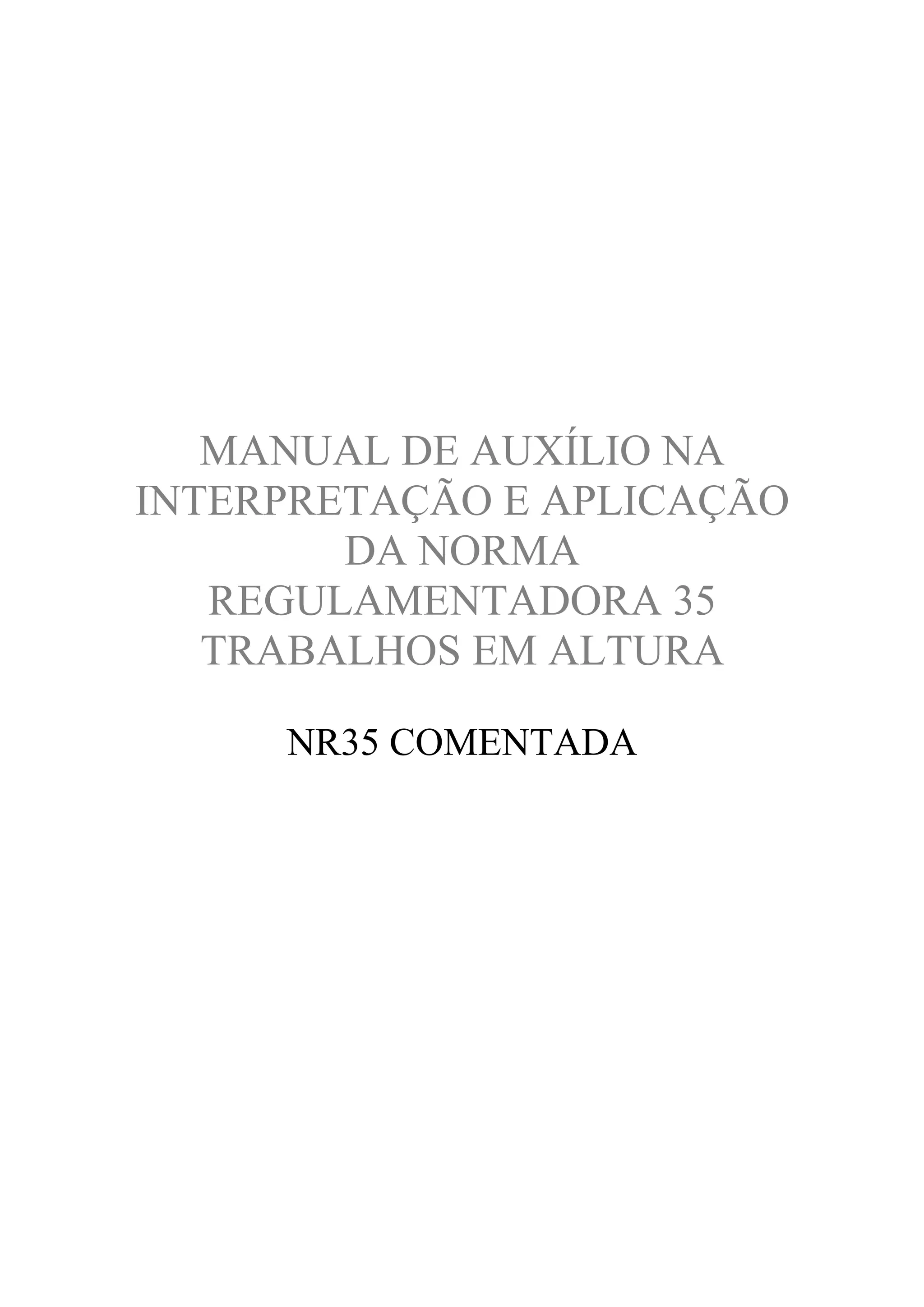 Este manual fornece orientações sobre a interpretação e aplicação da Norma Regulamentadora 35, que trata dos trabalhos em altura. O documento apresenta os principais pontos da norma, comentando seus objetivos, responsabilidades dos empregadores e trabalhadores, e requisitos para a realização segura de trabalhos em altura.