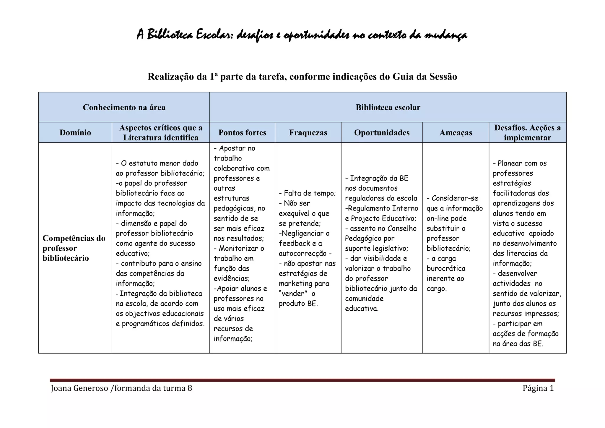 O documento discute os desafios e oportunidades para bibliotecas escolares. A biblioteca deve ser um recurso estratégico para o acesso à informação e conhecimento, apoiando a literacia e a leitura. É necessário tornar a biblioteca central para a aprendizagem, promovendo atividades que estimulem competências informativas ligadas aos projetos pedagógicos. Ações prioritárias incluem apoiar a literacia, integrar tecnologias, e coletar evidências para melhorar os serviços de acordo com as necessidades