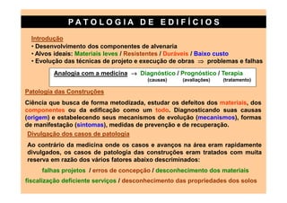 O documento discute patologias em edifícios, com foco na fissuração de alvenarias. As principais causas de fissuração incluem solicitações de tração, flexão e cisalhamento; movimentações térmicas e higroscópicas; e recalques diferenciados de fundações. Detalha também causas de descolamento entre estruturas e alvenarias, e problemas relacionados à qualidade dos materiais e aplicação de revestimentos.