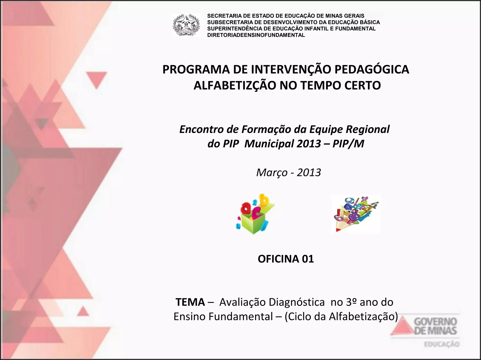 O documento descreve uma oficina de formação de professores sobre avaliação diagnóstica no 3o ano do ensino fundamental. A oficina aborda a construção e aplicação de instrumentos de avaliação, incluindo provas, atividades avaliativas e análise dos resultados para planejamento pedagógico. A oficina é dividida em três partes: apresentação dos instrumentos, trabalho em grupo e seminário.