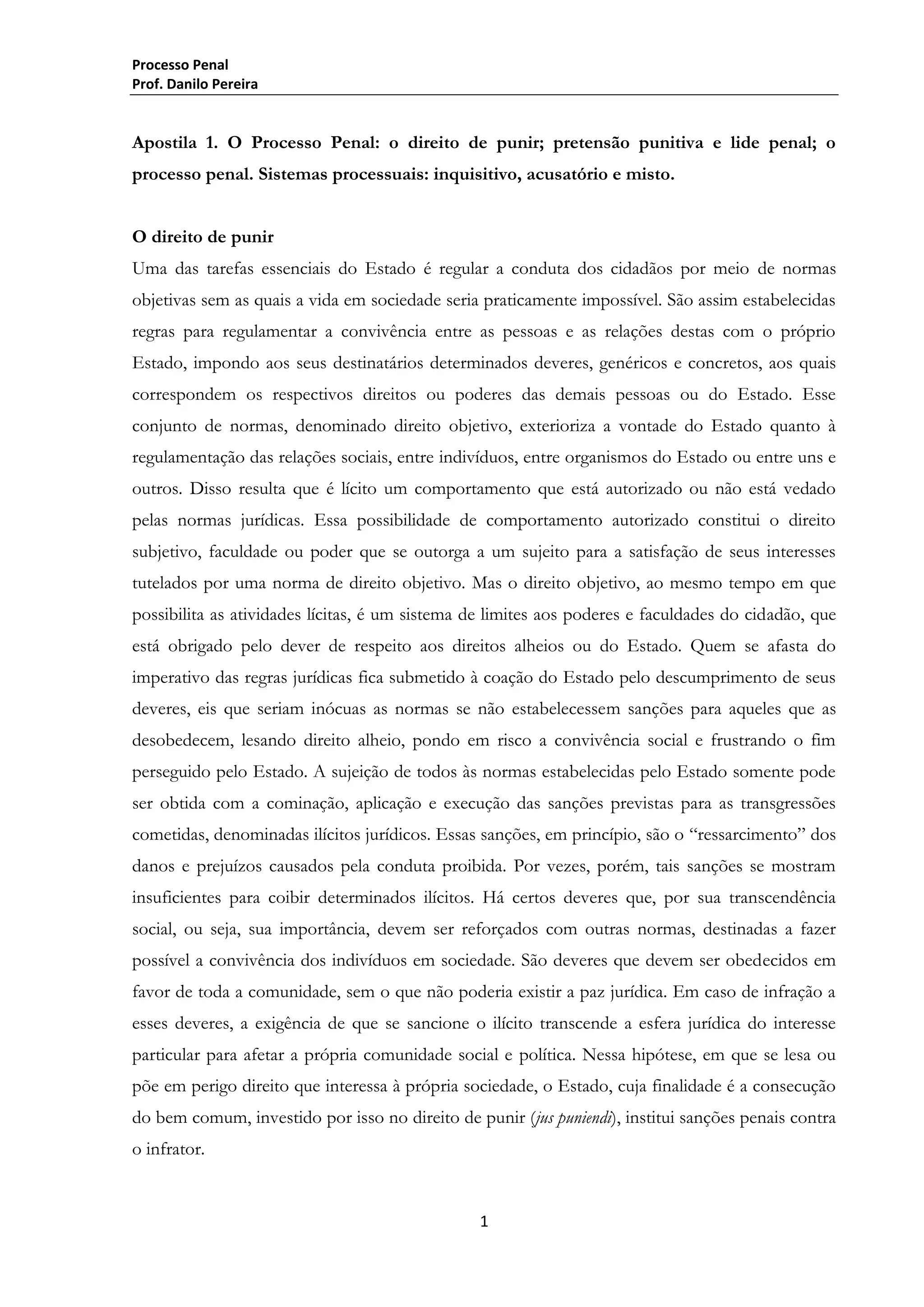 O documento discute o direito de punir do Estado e o processo penal. Brevemente, (1) o Estado tem o dever de punir infrações penais para manter a ordem social; (2) quando um crime é cometido, surge um conflito de interesses entre o Estado e o acusado que só pode ser resolvido no processo penal por um juiz imparcial; (3) o processo penal envolve vários órgãos estatais como a polícia, Ministério Público e juízes trabalhando juntos para aplicar a lei penal e punir os culpados.