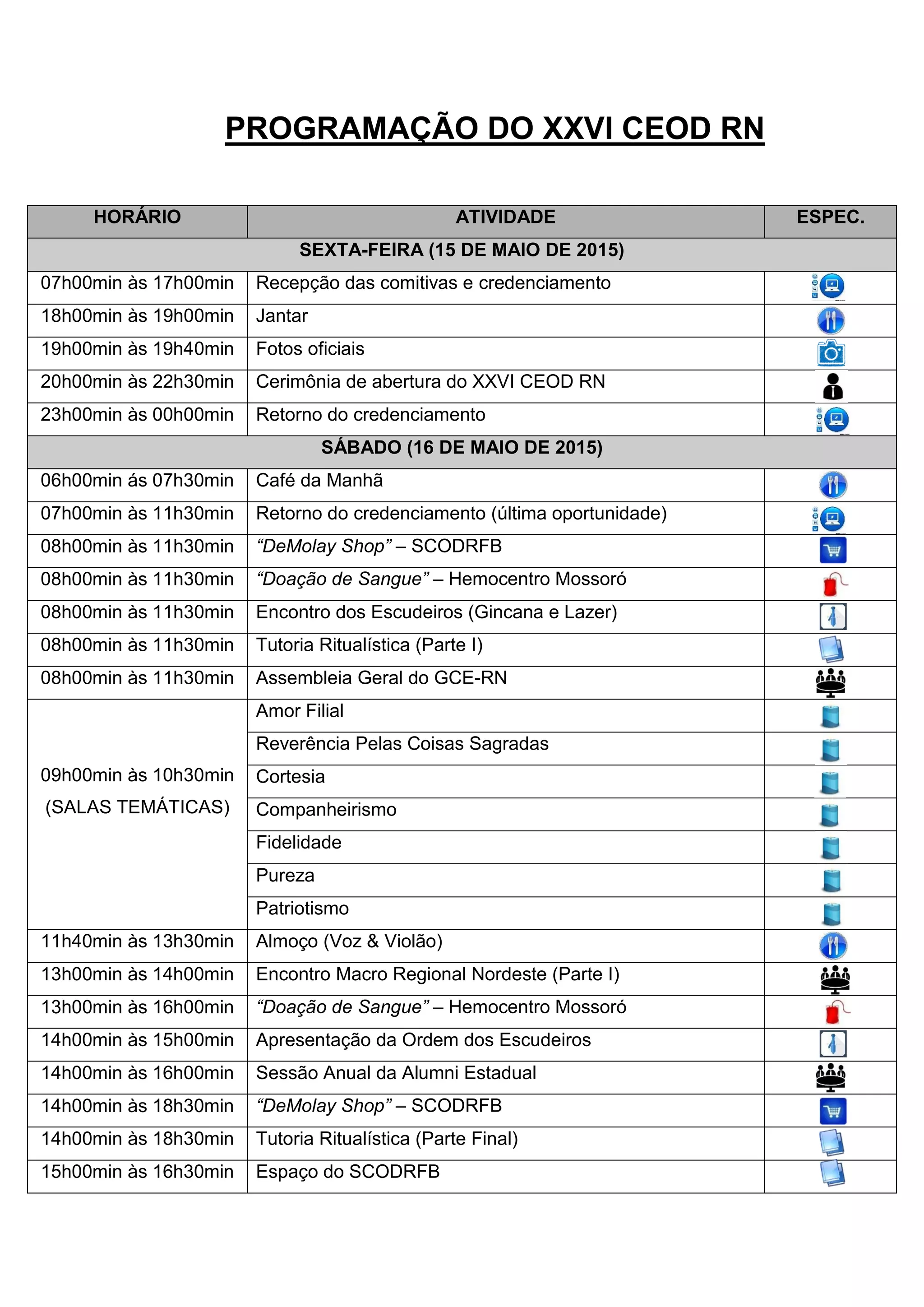 O documento descreve a programação do XXVI Congresso Estadual da Ordem DeMolay do Rio Grande do Norte. Acontecerá entre os dias 15 e 17 de maio de 2015 e incluirá eventos como recepção, jantares, cerimônias de abertura e encerramento, palestras, tutoriais, encontros, doações de sangue e campeonato de futsal. Haverá também atividades para os Escudeiros como gincana e lazer.