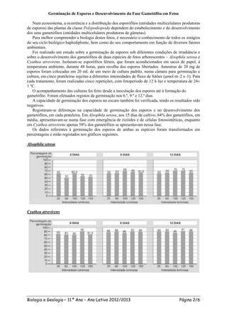 Este documento apresenta um estudo sobre a germinação de esporos e desenvolvimento inicial de gametófitos de duas espécies de fetos, Alsophila setosa e Cyathea atrovirens, sob diferentes intensidades luminosas. Os resultados mostram que a percentagem de germinação e desenvolvimento dos gametófitos variou entre as espécies e condições de luz, sugerindo que C. atrovirens tem vantagem na ocupação de novos habitats.