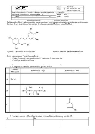 O documento discute a estrutura de flavonóides e pede ao aluno para completar informações sobre suas estruturas, incluindo fornecer fórmulas de traço e moléculas, classificar cadeias carbônicas, e marcar e numerar cadeias principais de moléculas.