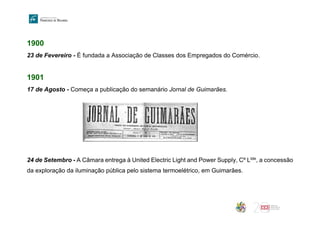 Este documento descreve vários eventos importantes em Guimarães durante a República, incluindo o estabelecimento de sindicatos e partidos políticos, greves operárias, e a implantação da República em 1910. Após a proclamação da República, uma comissão administrativa republicana foi nomeada para governar Guimarães, encerrando o domínio monárquico na cidade. A República trouxe mudanças como a separação entre Igreja e Estado.