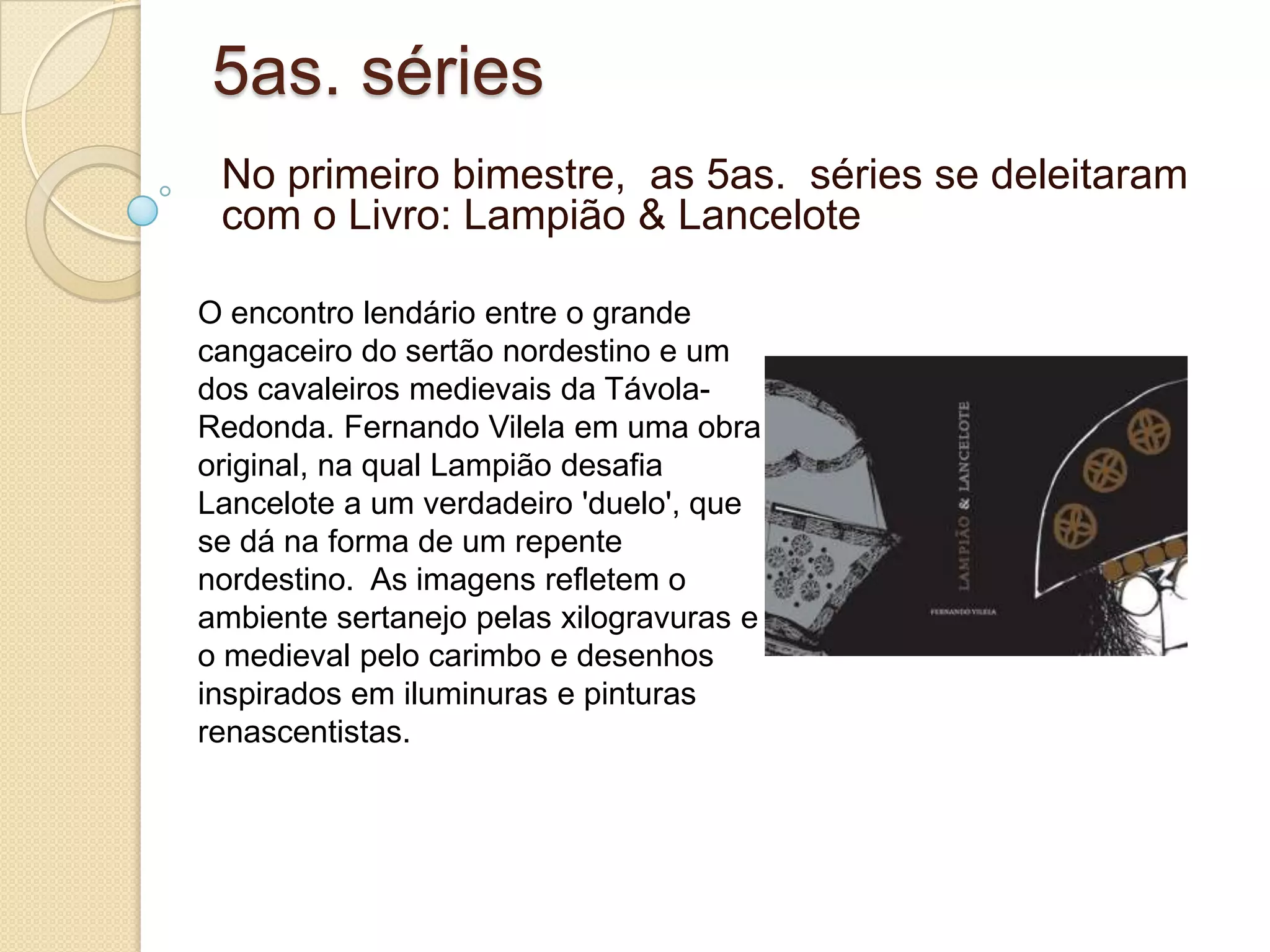 I. As 5as séries leram o livro "Lampião & Lancelote", sobre o encontro lendário entre o cangaceiro nordestino Lampião e o cavaleiro medieval Lancelote.