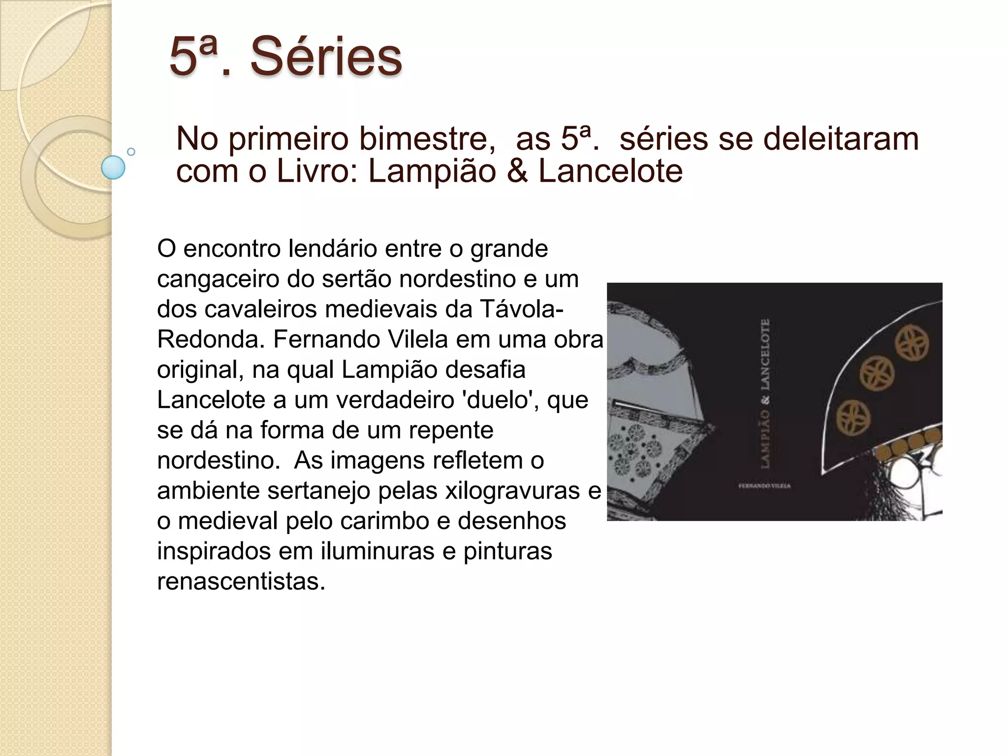 I. As 5a séries leram o livro "Lampião & Lancelote", sobre o encontro entre o cangaceiro nordestino e o cavaleiro medieval. Os alunos produziram cordel sobre a escola "Anibal de Freitas".