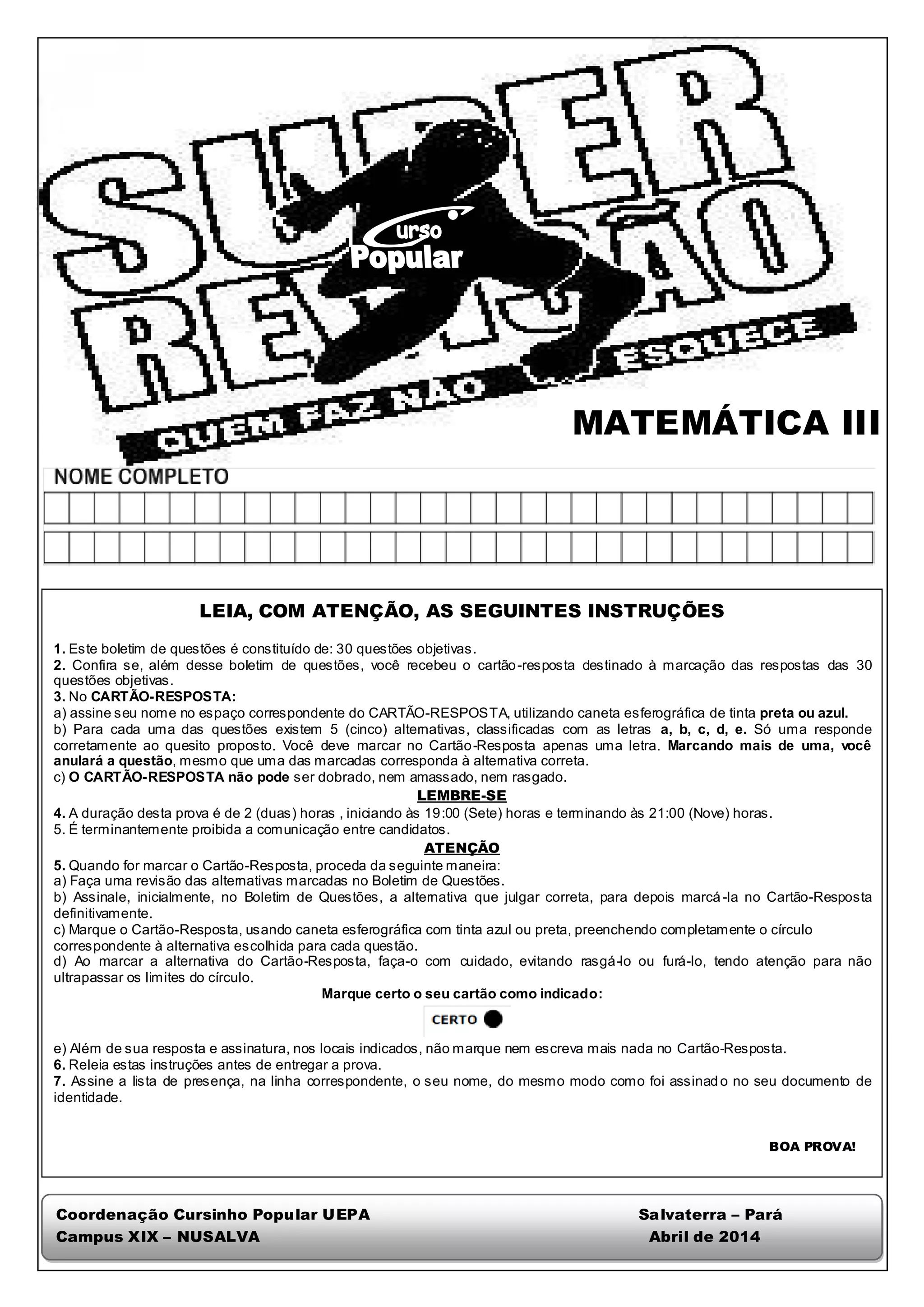 1. O documento fornece instruções sobre uma prova de Matemática III, incluindo o número e tipo de questões, como preencher o cartão de respostas e o tempo de duração da prova.