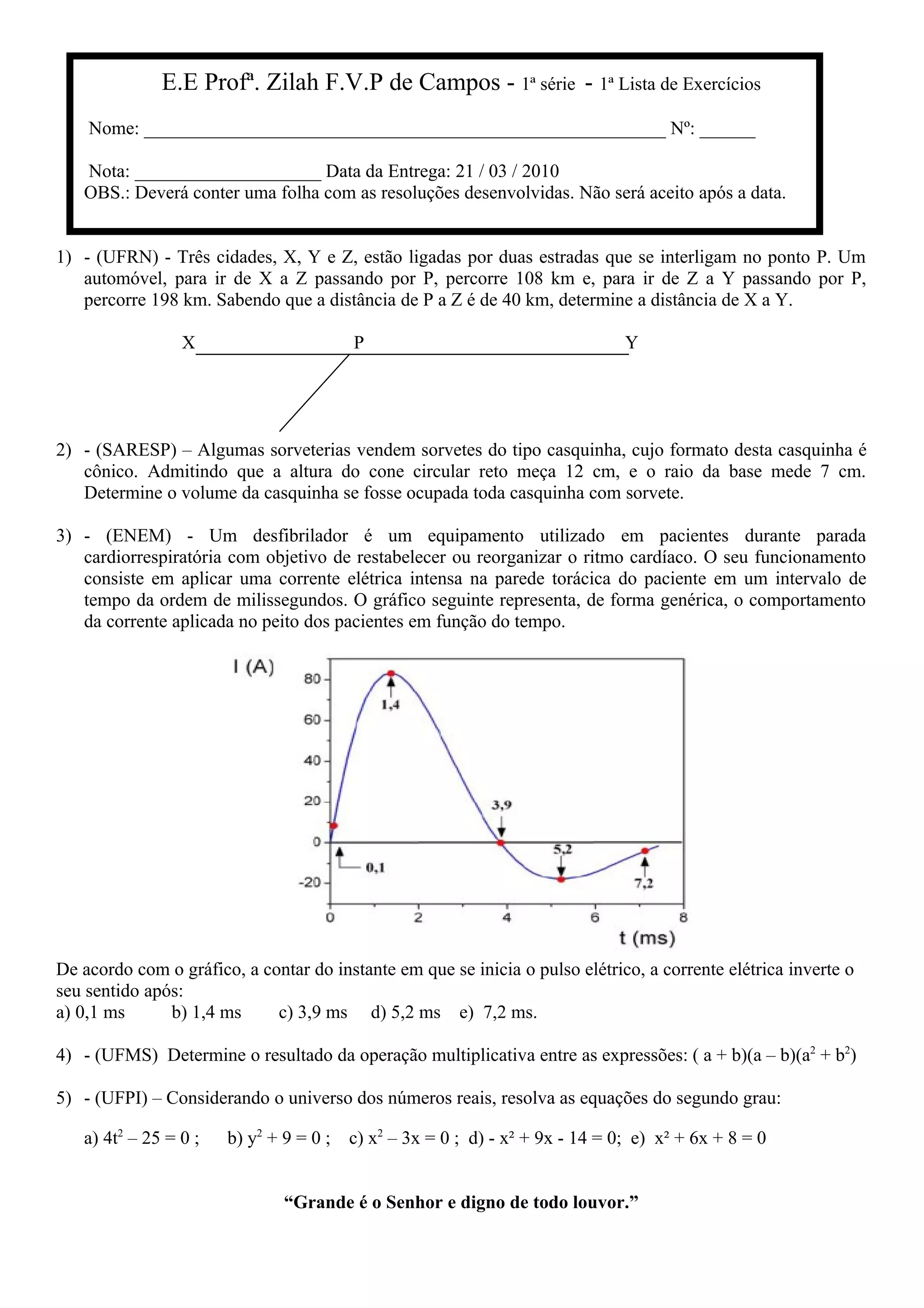 1) Uma lista de exercícios de matemática contém 5 problemas, incluindo determinar a distância entre três cidades ligadas por estradas e calcular o volume de uma casquinha de sorvete.