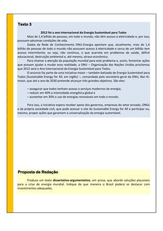 O documento discute a crise energética mundial, destacando que: (1) a demanda por energia deve aumentar mais de 50% nos próximos 25 anos devido ao crescimento populacional e do consumo; (2) mais de 1,4 bilhão de pessoas não tem acesso à eletricidade, afetando sua qualidade de vida; (3) a ONU estabeleceu metas para 2030 de acesso universal à energia sustentável e aumento do uso de fontes renováveis.