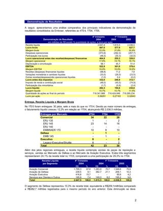 A Embraer anuncia os resultados do primeiro trimestre de 2005, com receita líquida de R$2,036 bilhões e lucro líquido de R$234,8 milhões. Foram entregues 30 aeronaves no trimestre. A receita cresceu 12,2% em relação ao mesmo período de 2004 devido ao maior número de entregas. O lucro líquido aumentou 20,7% em relação ao primeiro trimestre de 2004.
