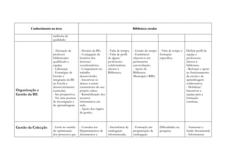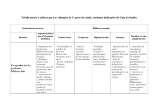 O documento apresenta uma tabela com uma análise SWOT sobre a biblioteca escolar, identificando as suas forças, fraquezas, oportunidades e ameaças. São apontados desafios como a falta de formação específica de professores bibliotecários, a necessidade de definir melhor o seu perfil e competências, e incentivar uma maior colaboração entre departamentos e utilização da biblioteca como espaço de aprendizagem.