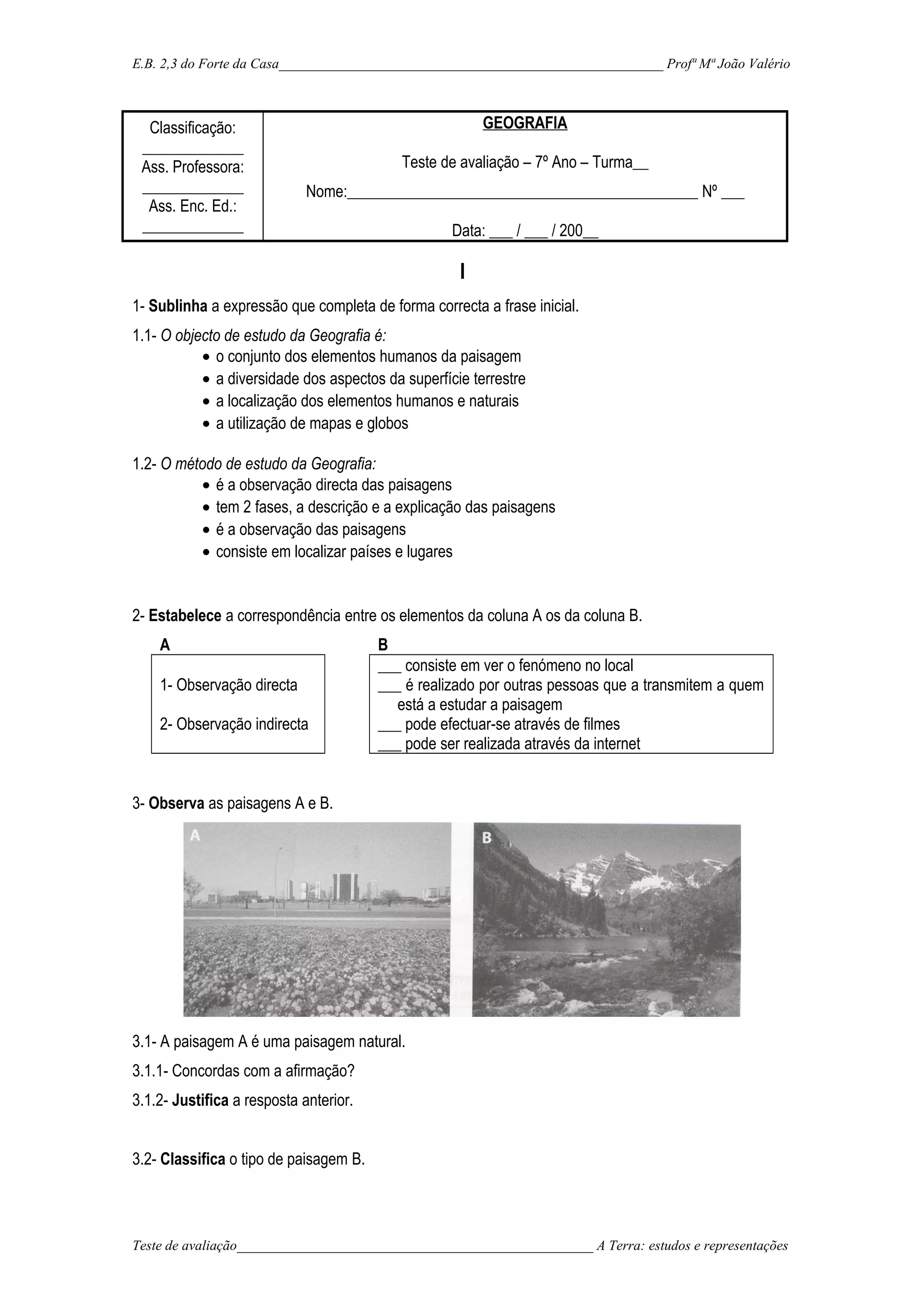 Este documento apresenta um teste de avaliação de Geografia para alunos do 7o ano. O teste inclui questões sobre os objetos de estudo e métodos da Geografia, a interpretação e classificação de paisagens, a utilização e elementos de mapas, e a representação de fenómenos geográficos.