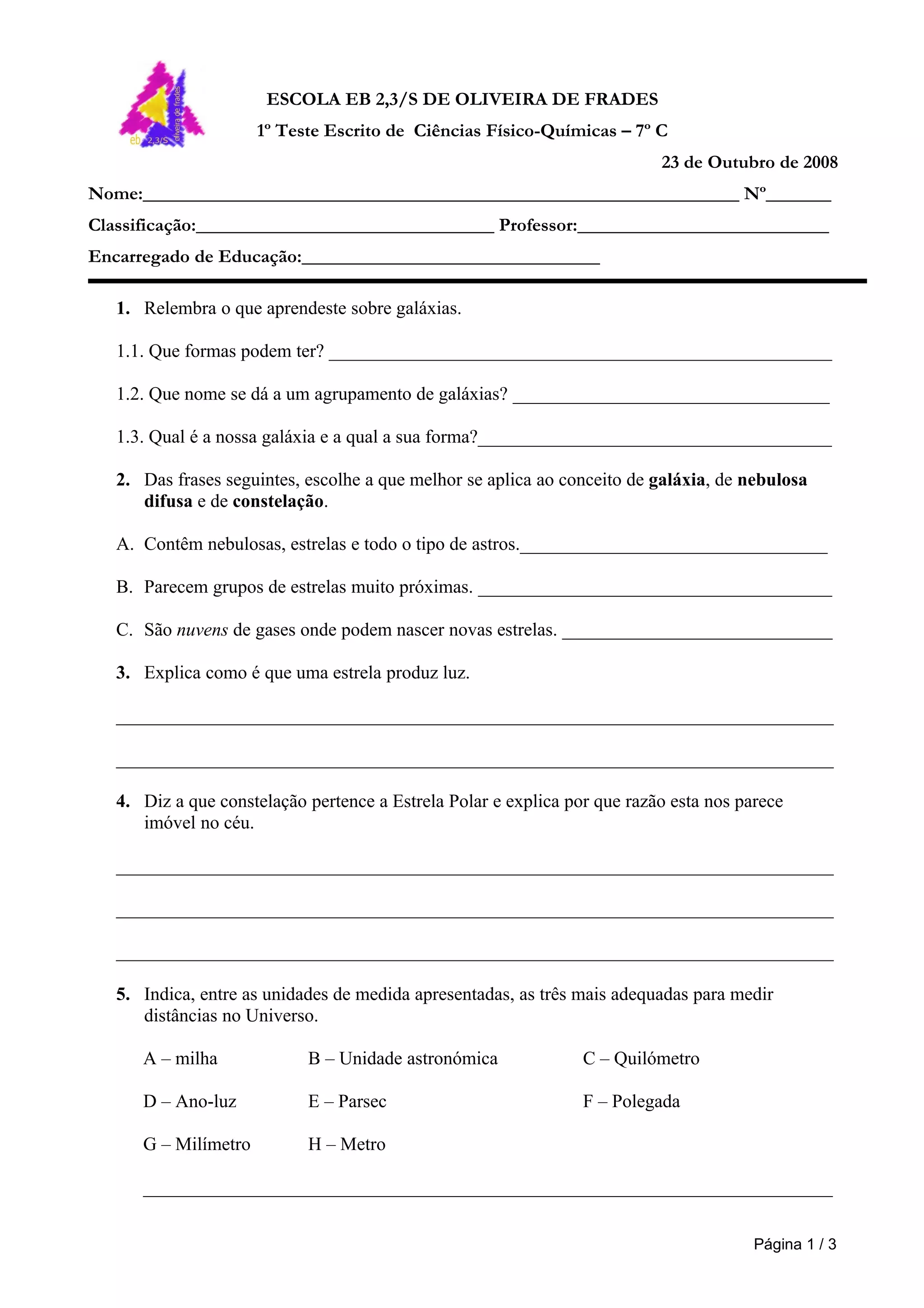 1) O documento contém um teste de Ciências Físico-Químicas sobre galáxias, estrelas e o universo para alunos do 7o ano.