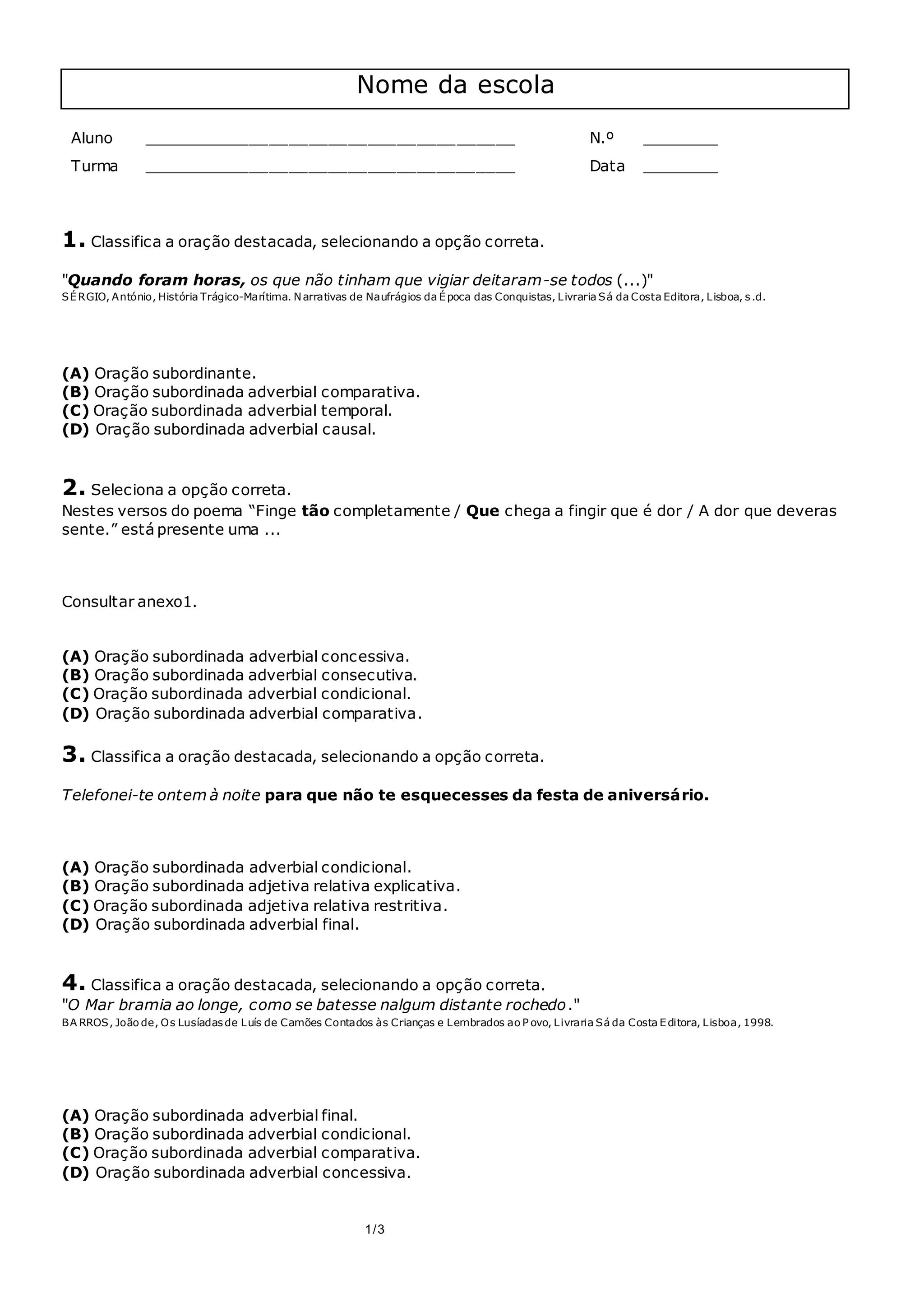 Este documento é um teste sobre classificação de orações subordinadas. Contém 10 questões de múltipla escolha sobre identificar e classificar diferentes tipos de orações subordinadas adverbiais em frases dadas, como temporais, finais, concessivas e comparativas. O teste é acompanhado de um anexo com um poema para referência em uma das questões.