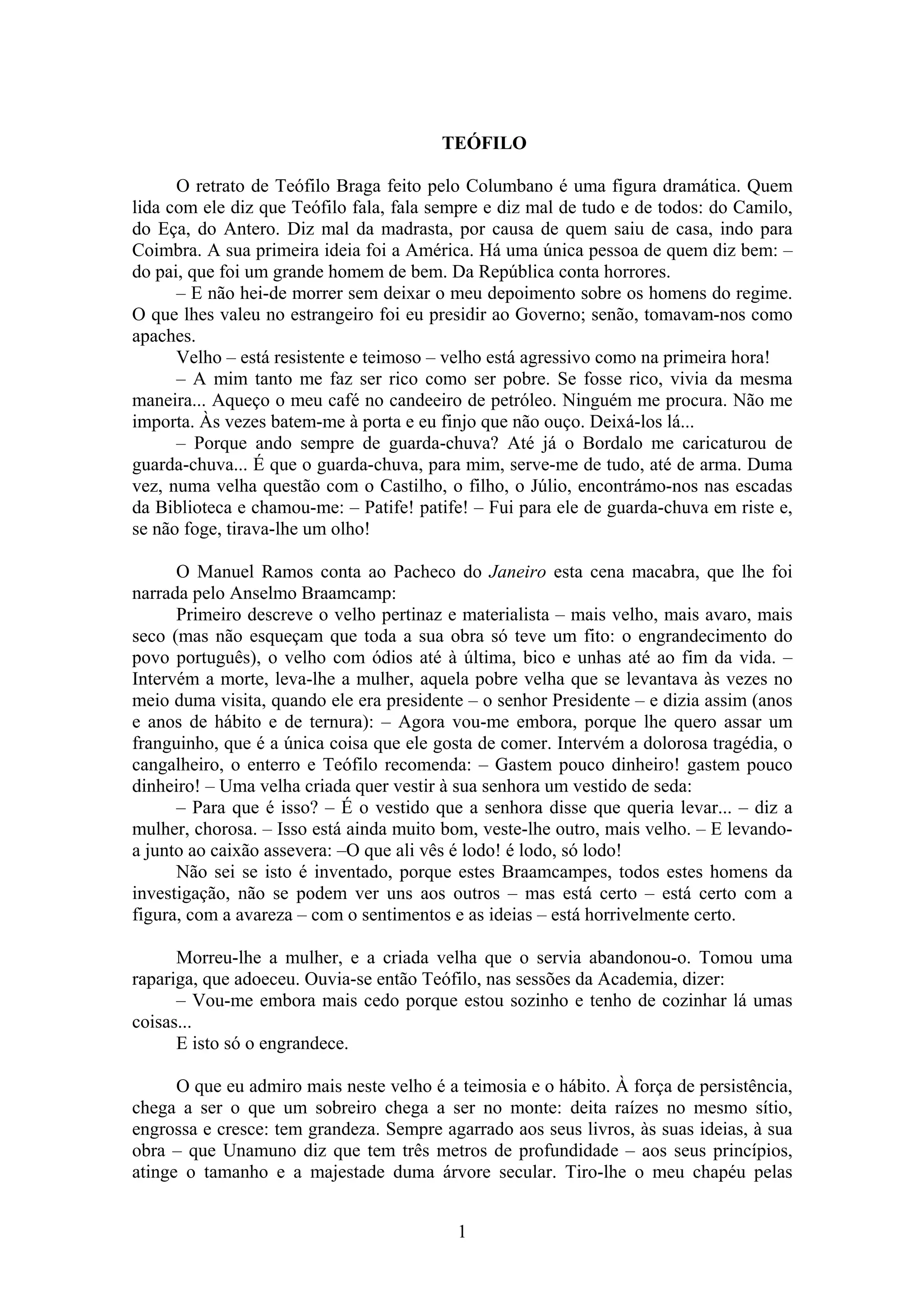 O documento descreve Teófilo Braga, um político português, como uma figura dramática e teimosa. Apesar de ser velho e agressivo, ele continua firme em suas ideias e rancores. Ele vive simplesmente e não se importa com a opinião dos outros. A morte de sua esposa o afeta profundamente, mas ele continua trabalhando e cozinhando sozinho.