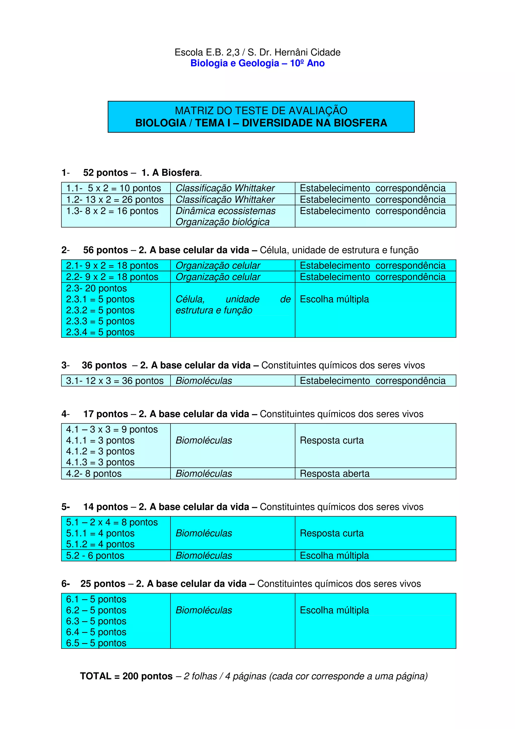 O documento apresenta uma matriz de avaliação para um teste de Biologia sobre a diversidade na Biosfera. A matriz inclui questões sobre a classificação de Whittaker, estruturas e funções celulares, biomoléculas e ácidos nucleicos. O teste é constituído por 6 temas e 200 pontos no total.