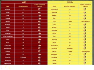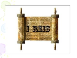 O documento resume os livros de 1 e 2 Reis, narrando a ascensão e queda do Reino de Israel. Aborda o estabelecimento do reino unido sob Salomão, sua divisão em dois reinos após sua morte, e o declínio dos reinos de Israel e Judá devido à idolatria e afastamento de Deus ao longo dos séculos seguintes.
