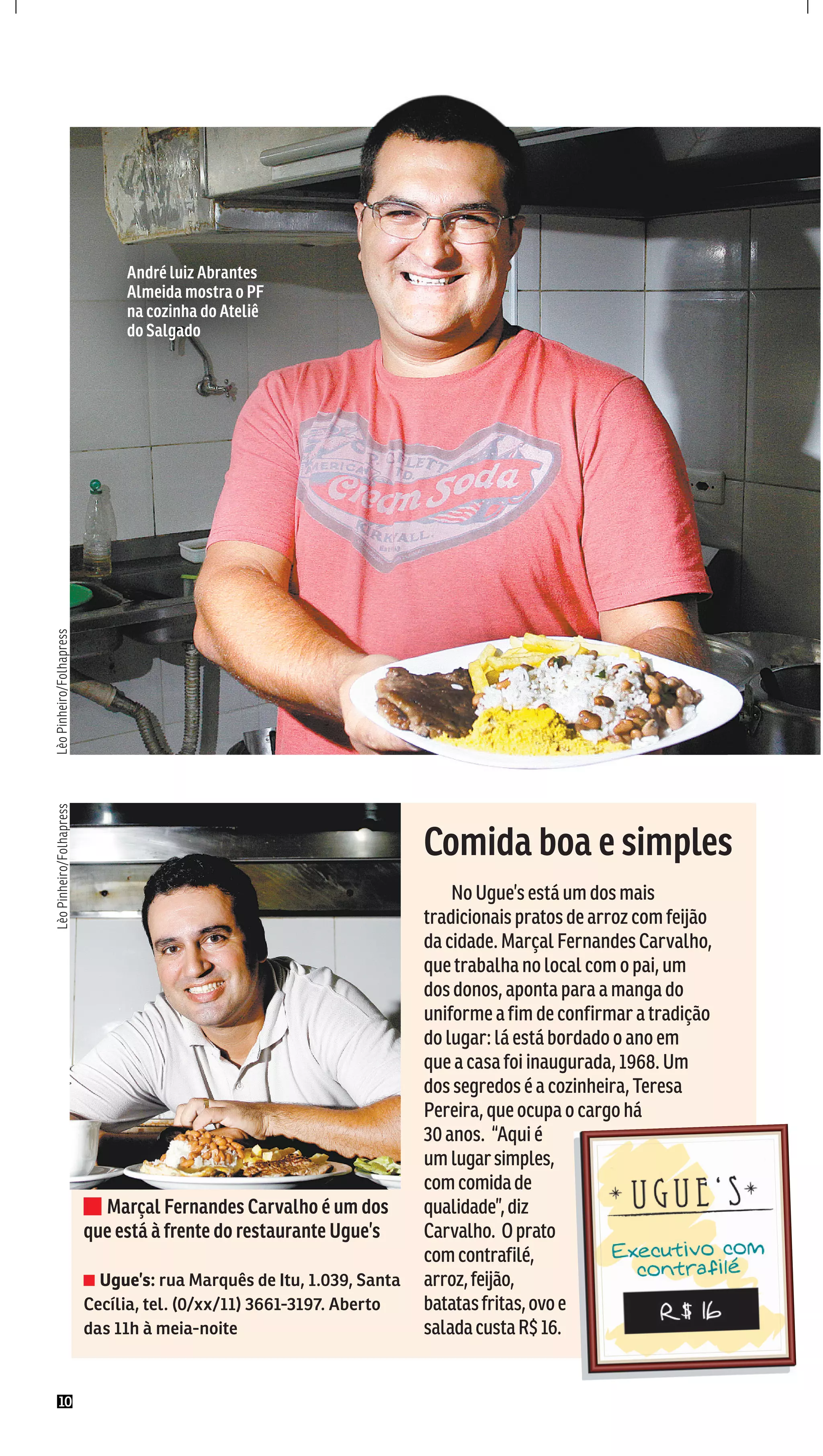 A foto mostra André Luiz Abrantes Almeida preparando comida na cozinha do Ateliê do Salgado. A matéria descreve o restaurante tradicional Ugue's, que serve arroz e feijão há mais de 50 anos, com uma cozinheira trabalhando no local há 30 anos.