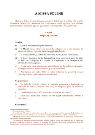 Este documento fornece instruções detalhadas sobre a organização e procedimentos de uma Missa Solene, incluindo: