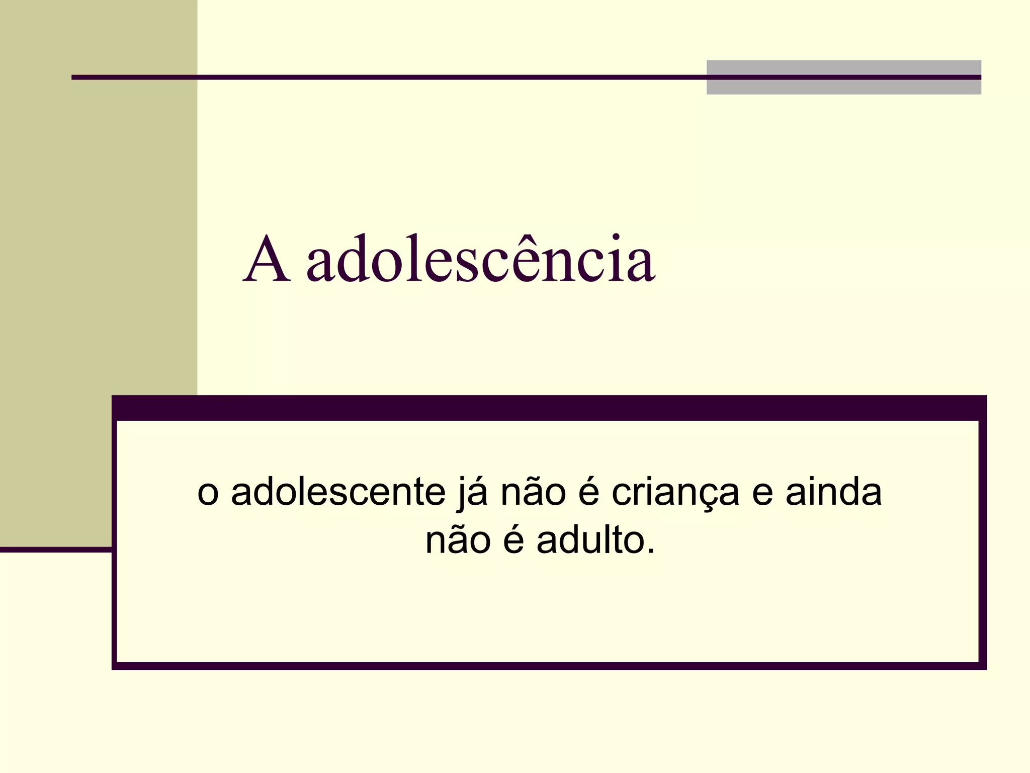A adolescência é um período de transição entre a infância e a idade adulta marcado por transformações físicas, emocionais e sociais. Nesta fase, os jovens começam a abandonar a proteção familiar enquanto constroem sua identidade e autonomia. É um período desafiador marcado por incertezas sobre o futuro e a busca por um senso de pertencimento.