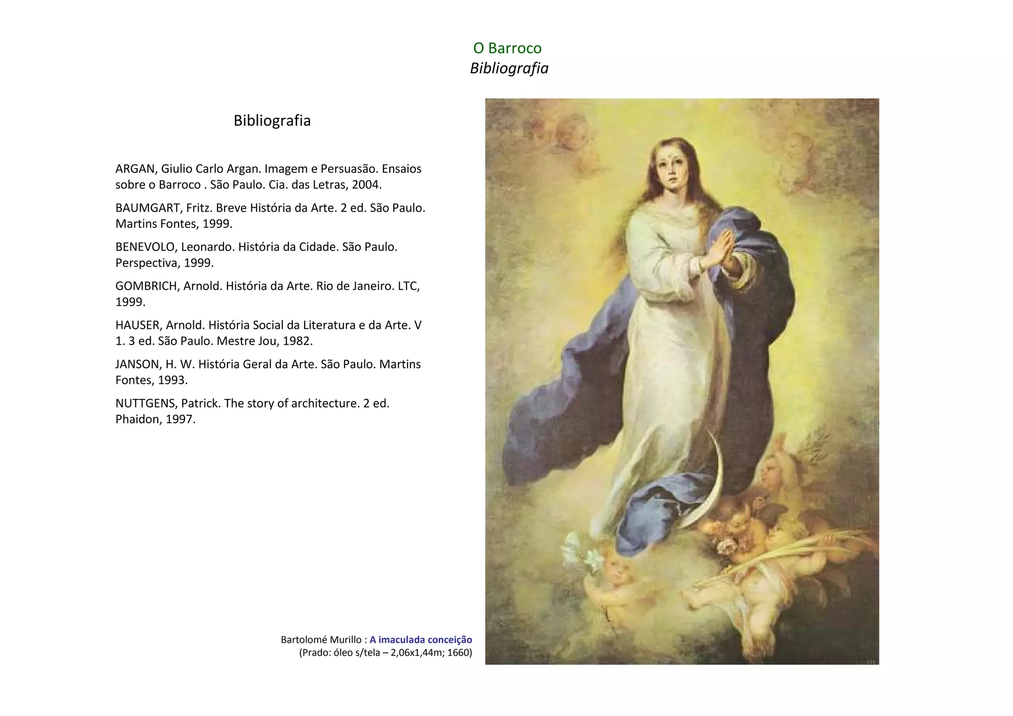 O documento fornece uma bibliografia sobre o período artístico do Barroco na Europa católica da primeira metade do século XVII. A bibliografia lista obras que abordam artistas como Bernini, Caravaggio e Velázquez e movimentos como o Barroco italiano e espanhol.