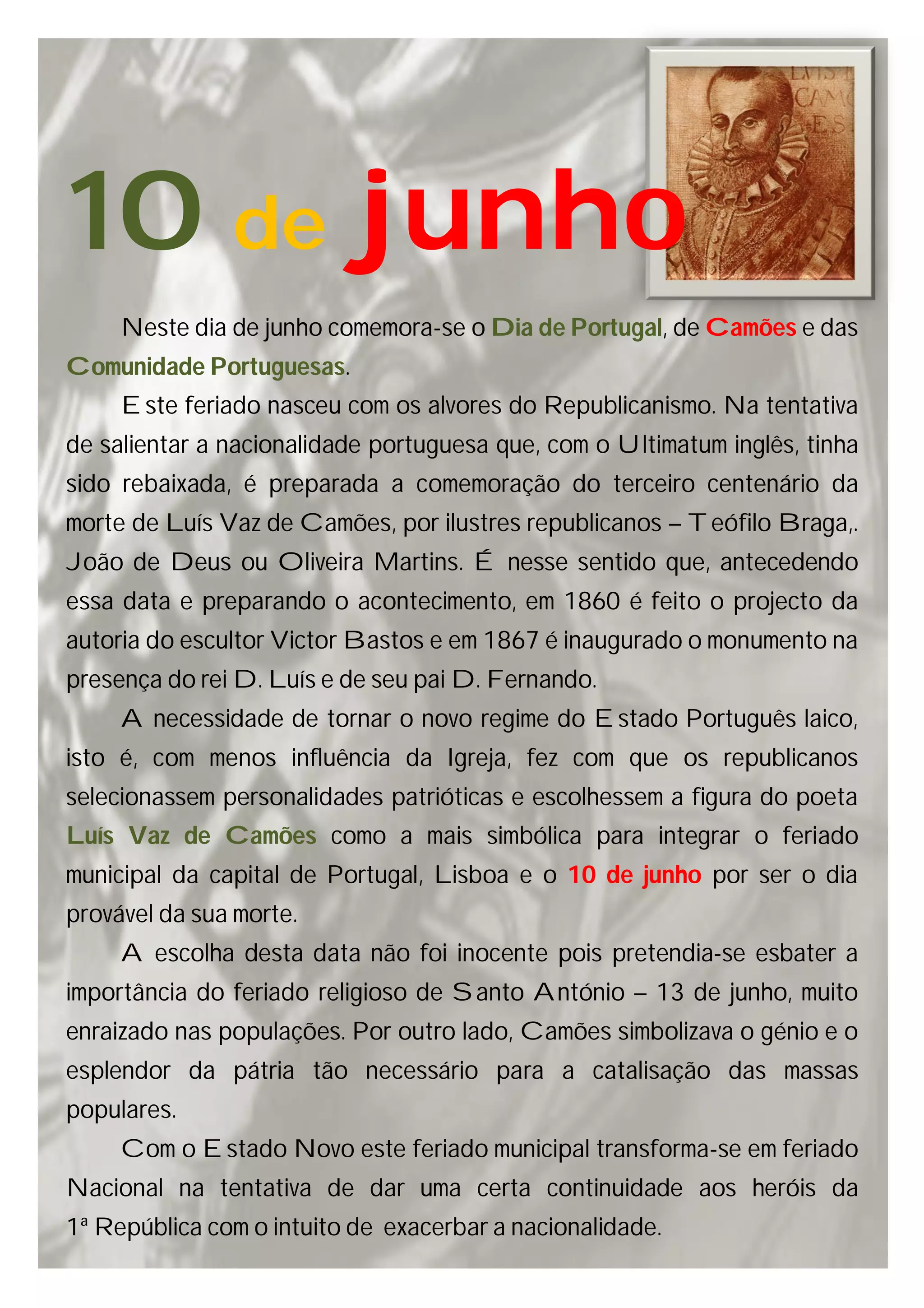 O documento descreve como o Dia de Portugal, de Camões e das Comunidades Portuguesas originou-se como um feriado municipal em Lisboa para comemorar o terceiro centenário da morte de Luís Vaz de Camões em 10 de junho e como posteriormente se tornou um feriado nacional no Estado Novo para celebrar heróis e a nacionalidade portuguesa.