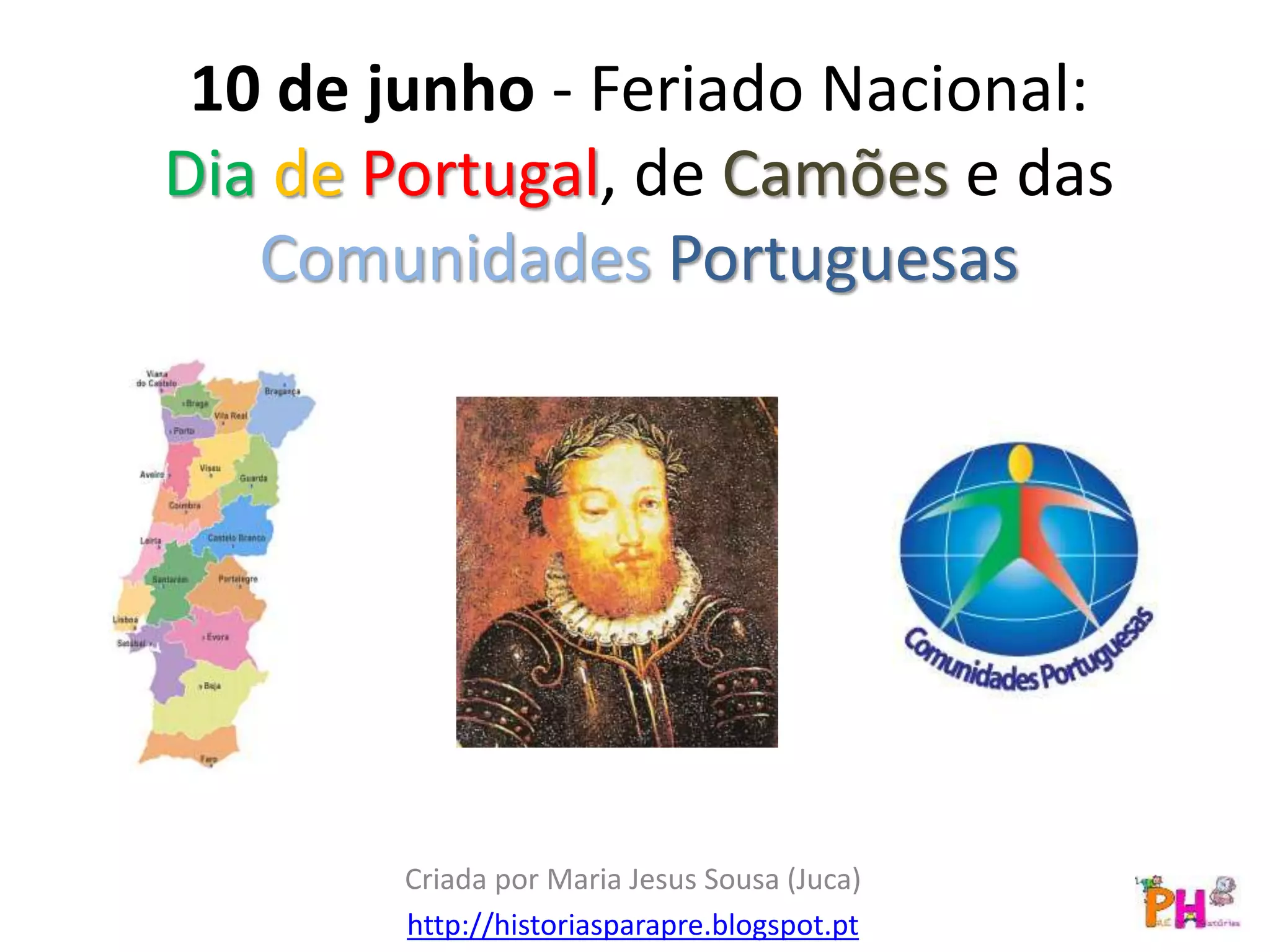 O dia 10 de junho é um feriado nacional em Portugal, que celebra o país e seus símbolos, como Luís Vaz de Camões, cuja morte ocorreu em 1580. Além de Camões, a bandeira nacional, o hino 'A Portuguesa' e a língua portuguesa também representam o país. O feriado, antes chamado 'dia da raça', agora é reconhecido como o dia das comunidades portuguesas, homenageando tanto os residentes quanto os emigrantes.