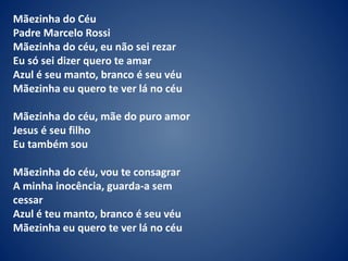 O documento celebra a figura de Maria, destacando seu papel como mãe de Jesus e sua importância na história da salvação. Ele menciona eventos como a Anunciação e a visita a Isabel, além de apresentar dogmas marianos e várias invocações a Nossa Senhora. A obra exalta a humildade e a intercessão de Maria, enfatizando a necessidade de veneração em vez de adoração.