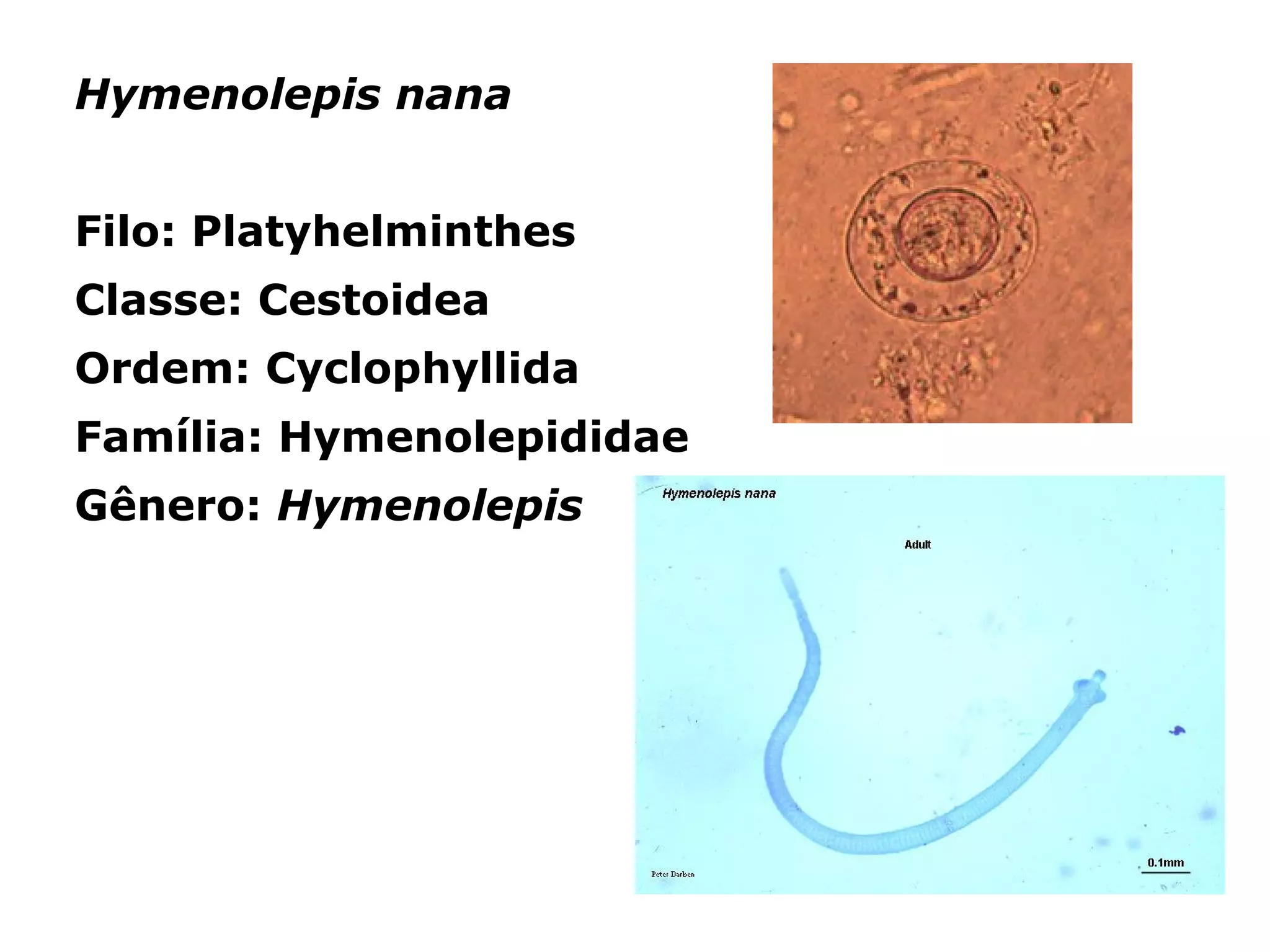 Hymenolepis nana é um cestódeo humano comum que causa poucas manifestações clínicas. Seu ciclo de vida envolve a ingestão de ovos ou larvas cisticercóides encontrados em insetos, resultando na infecção do hospedeiro humano. Sua prevenção envolve medidas de higiene pessoal e ambiental para evitar a transmissão dos ovos entre hospedeiros.