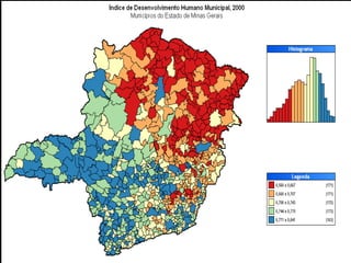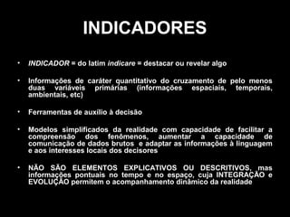 O documento discute indicadores e índices ambientais, definindo-os como ferramentas para facilitar a compreensão de fenômenos ambientais e apoiar a tomada de decisão. Apresenta exemplos como o IDH, que integra indicadores de saúde, educação e renda; e o cálculo do índice de área verde por habitante para avaliar a cobertura vegetal urbana.