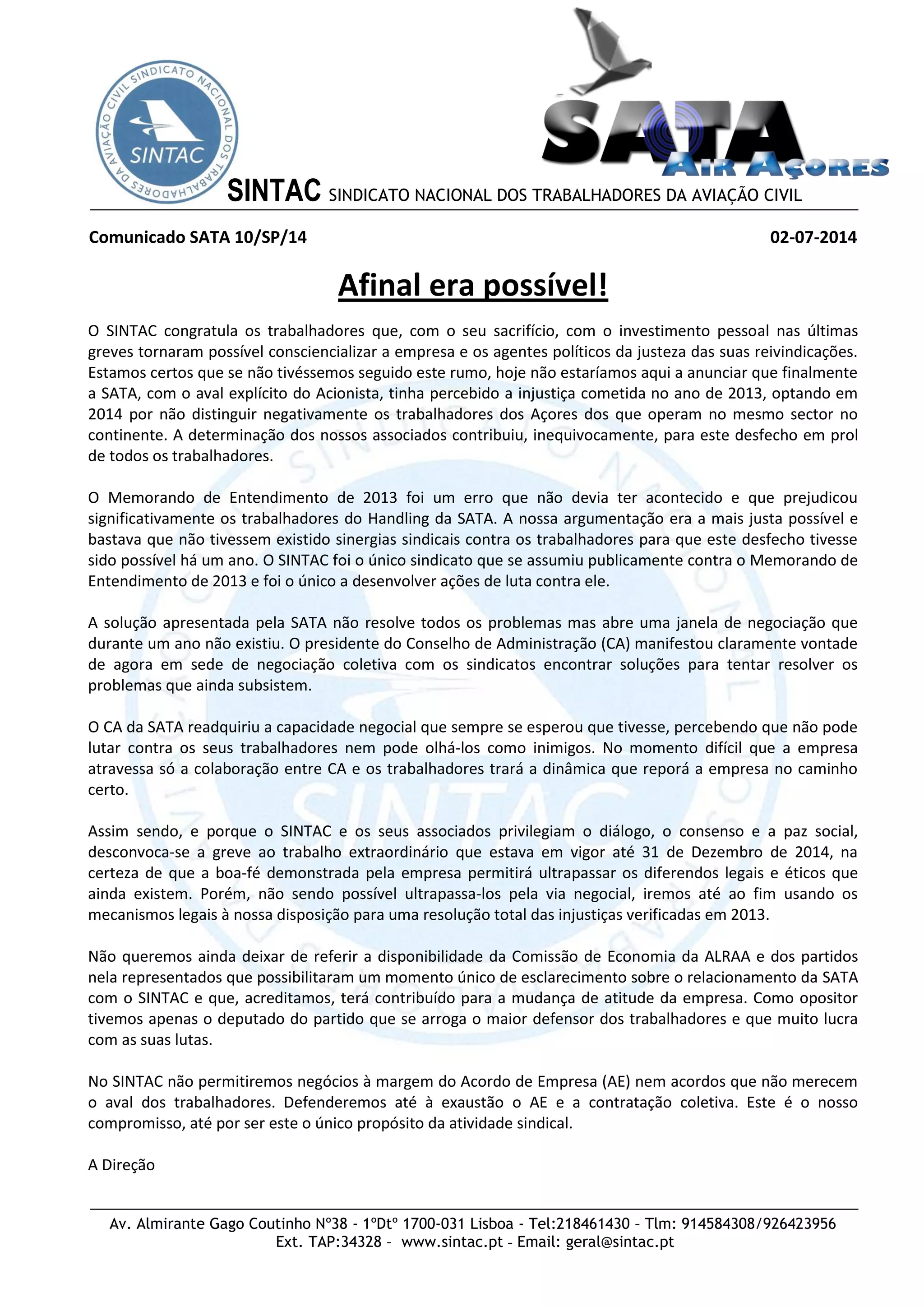 O sindicato SINTAC parabeniza os trabalhadores da SATA por sua determinação em lutar por suas reivindicações, o que levou a empresa a reconhecer injustiças de 2013 e igualar salários de trabalhadores dos Açores aos do continente em 2014. A greve ao trabalho extraordinário foi desconvocada em esperança de que negociações coletivas resolvam problemas remanescentes. O sindicato continuará defendendo o acordo coletivo de trabalho.