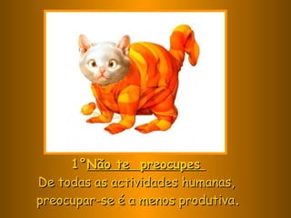 O documento fornece 10 dicas para lidar com preocupações, medo, problemas e frustrações de forma positiva, incluindo não se preocupar demasiado, não se deixar dominar pelo medo, enfrentar problemas um de cada vez, não levar problemas para a cama, concentrar-se no presente, ouvir os outros, não se abater pela frustração e contabilizar as coisas boas na vida.