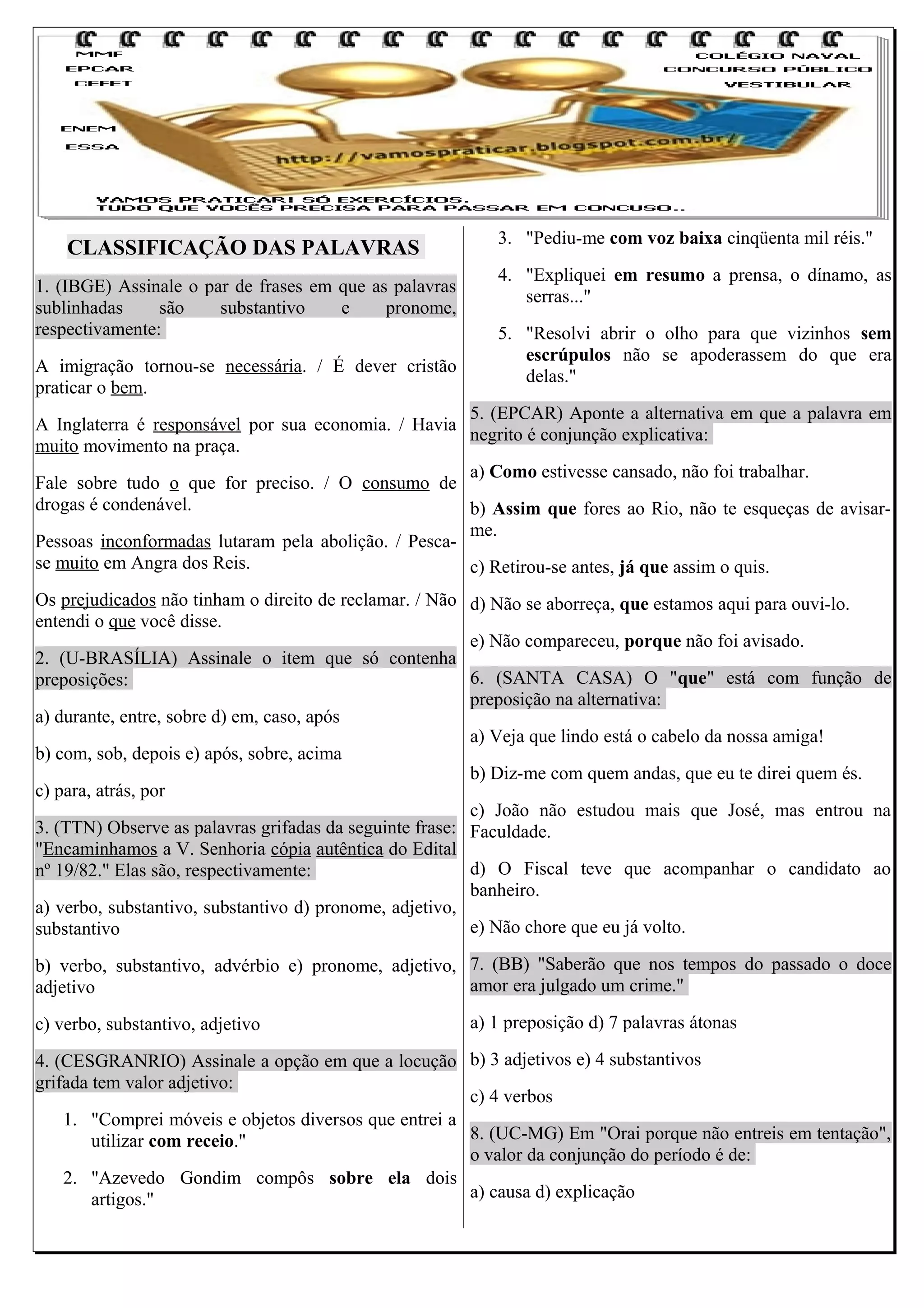 3) A tarefa é assinalar a alternativa correta de acordo com a classificação gramatical da(s) palavra(s) destacada(s) em cada questão.