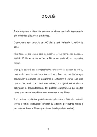 2. O programa consiste em 10 módulos realizados ao longo de 100 dias, cada um contendo um romance e um filme, além de um teste.