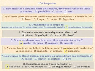 O documento apresenta 100 perguntas sobre diversos assuntos, com quatro alternativas de resposta cada, sendo metade delas fáceis. As respostas são marcadas com quadradinhos brancos ou amarelos para indicar se a pergunta é fácil ou não. O leitor é incentivado a anotar os acertos.