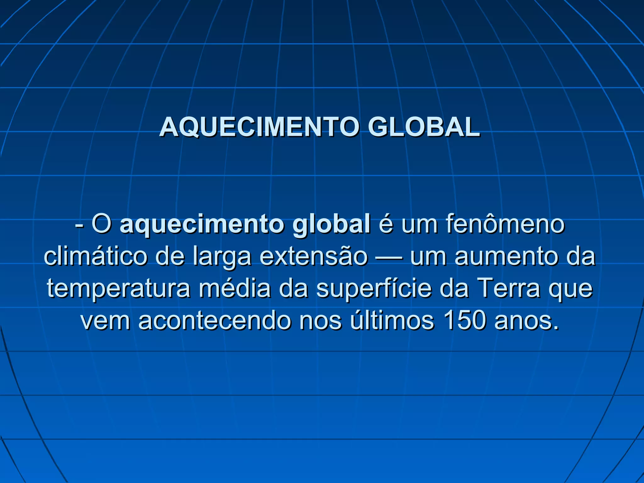 O documento discute o aquecimento global e o efeito estufa, explicando que o aumento das temperaturas médias da Terra nos últimos 150 anos é causado pelas emissões de gases causadores do efeito estufa provenientes de atividades humanas. Isso tem provocado consequências como o derretimento de geleiras, o aumento do nível do mar e eventos climáticos extremos, ameaçando cidades costeiras e ecossistemas.