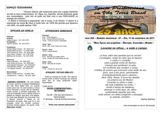 Este documento fornece informações sobre as atividades e liderança da Igreja Presbiteriana em Vila Terra Brasil. Ele destaca a importância dos dízimos para manter os compromissos da igreja e apoiar os necessitados, e lista as reuniões semanais incluindo cultos, estudos bíblicos e ensaios musicais.