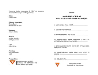 Este documento fornece diretrizes e sugestões para atividades recreativas saudáveis para jovens. Ele discute como a recreação deve fortalecer ao invés de enfraquecer, e como deve aproximar os jovens de Deus. O documento também lista diversões que não são recomendadas e oferece critérios para julgar se uma atividade específica promove valores positivos ou negativos.