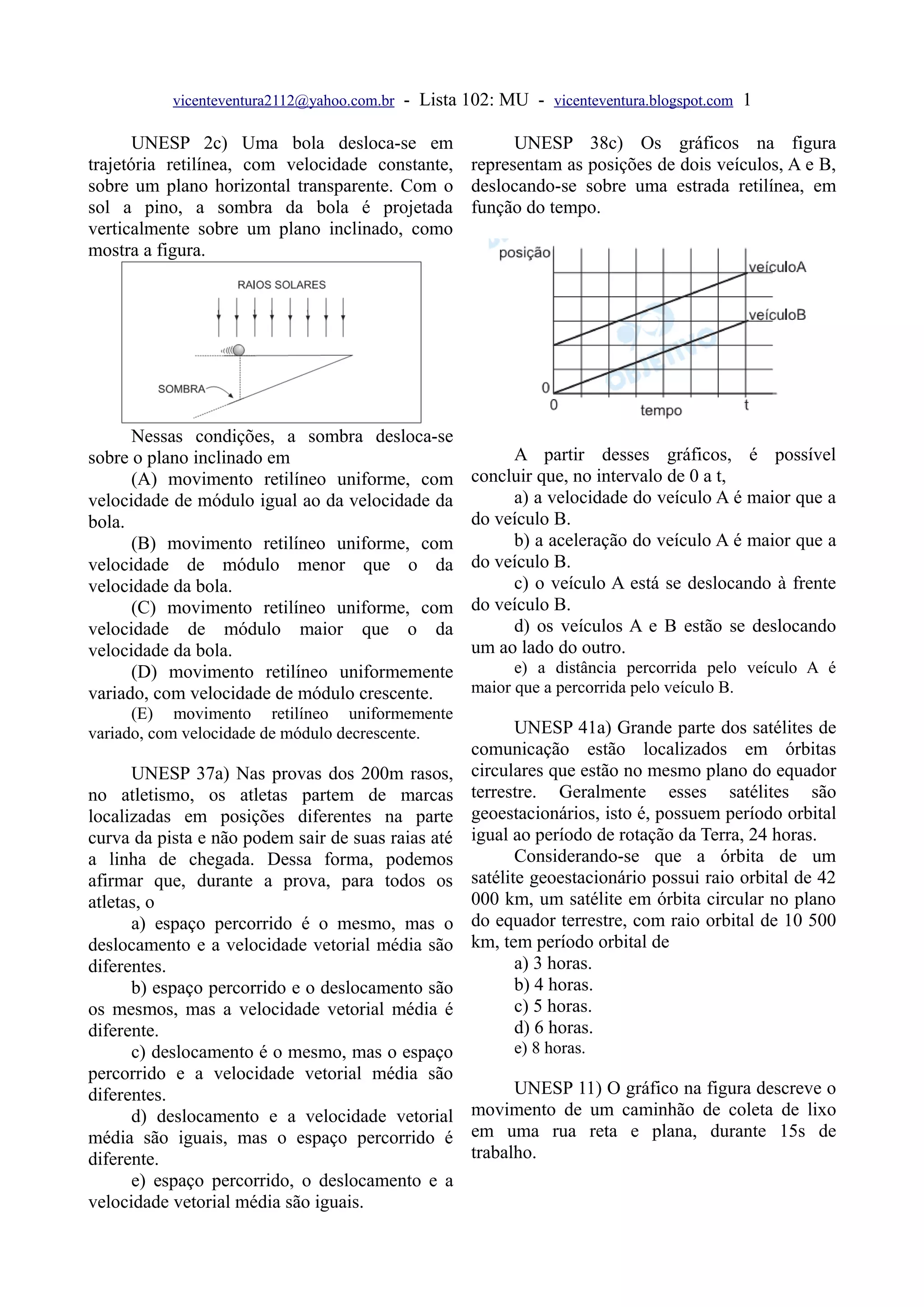 O documento apresenta questões sobre física e matemática relacionadas a movimento retilíneo uniforme, velocidade, aceleração e outros conceitos cinemáticos. As questões envolvem situações como deslocamento de veículos, satélites, projéteis, ondas sísmicas, entre outros.