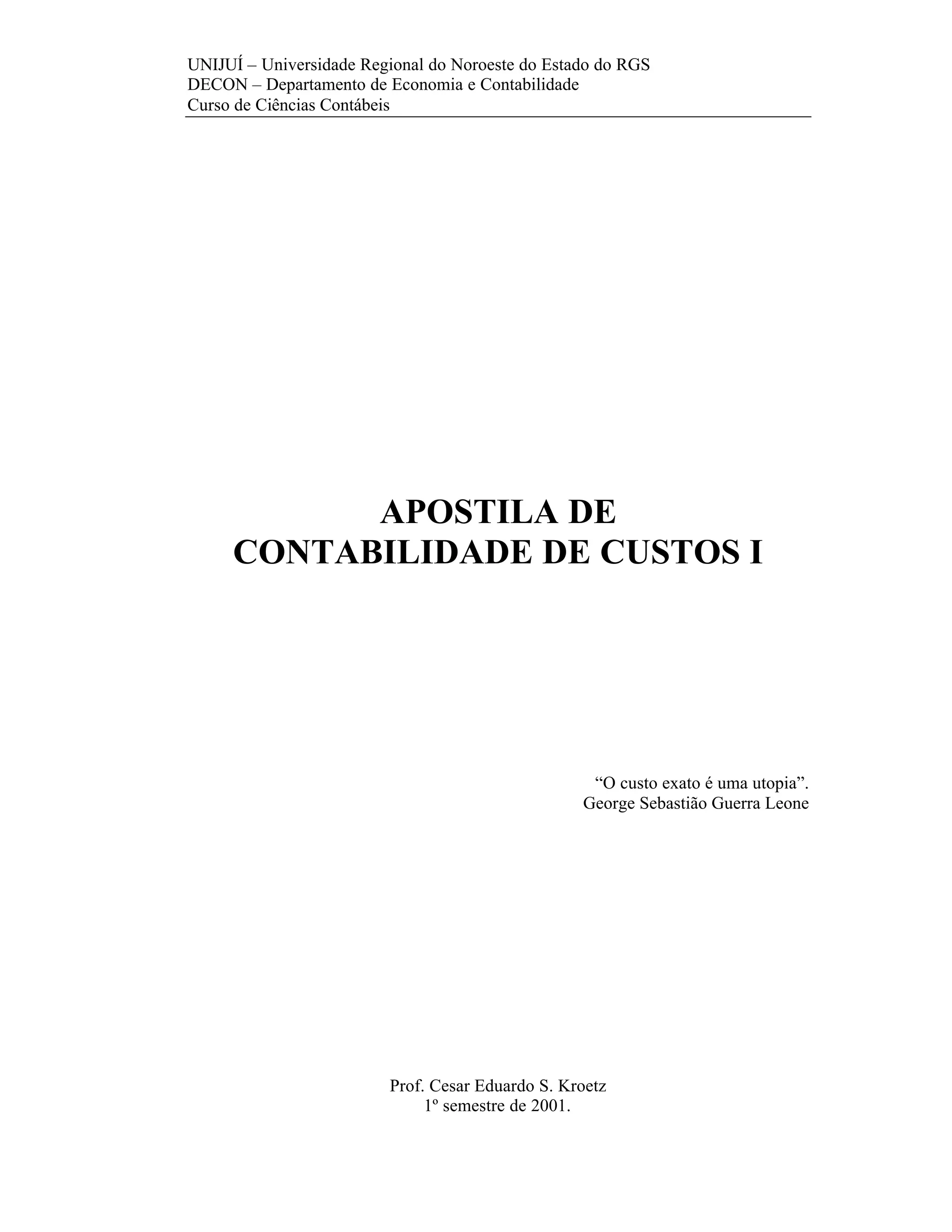 1) O documento apresenta uma apostila sobre contabilidade de custos I, introduzindo os conceitos básicos da ciência contábil e da contabilidade de custos.