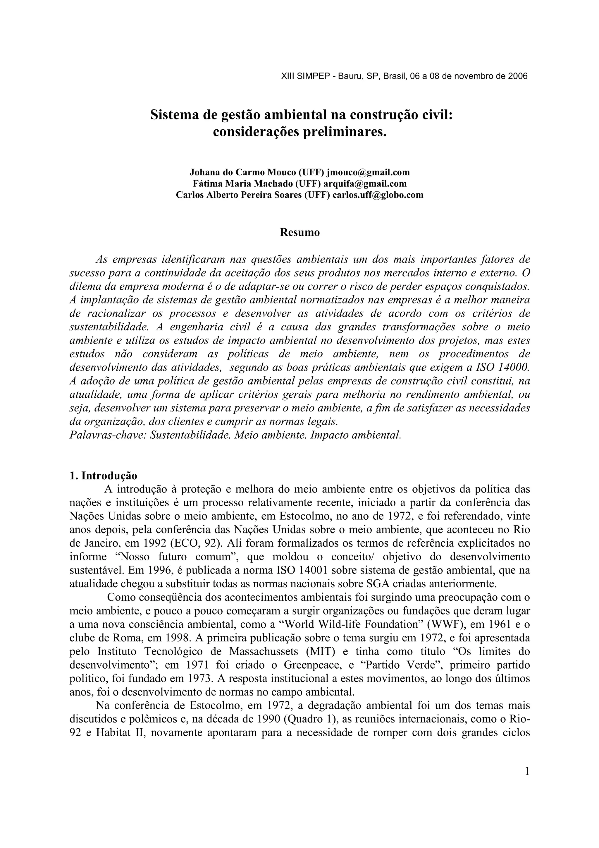 1. O documento discute a implementação de sistemas de gestão ambiental nas empresas de construção civil de acordo com a norma ISO 14001.