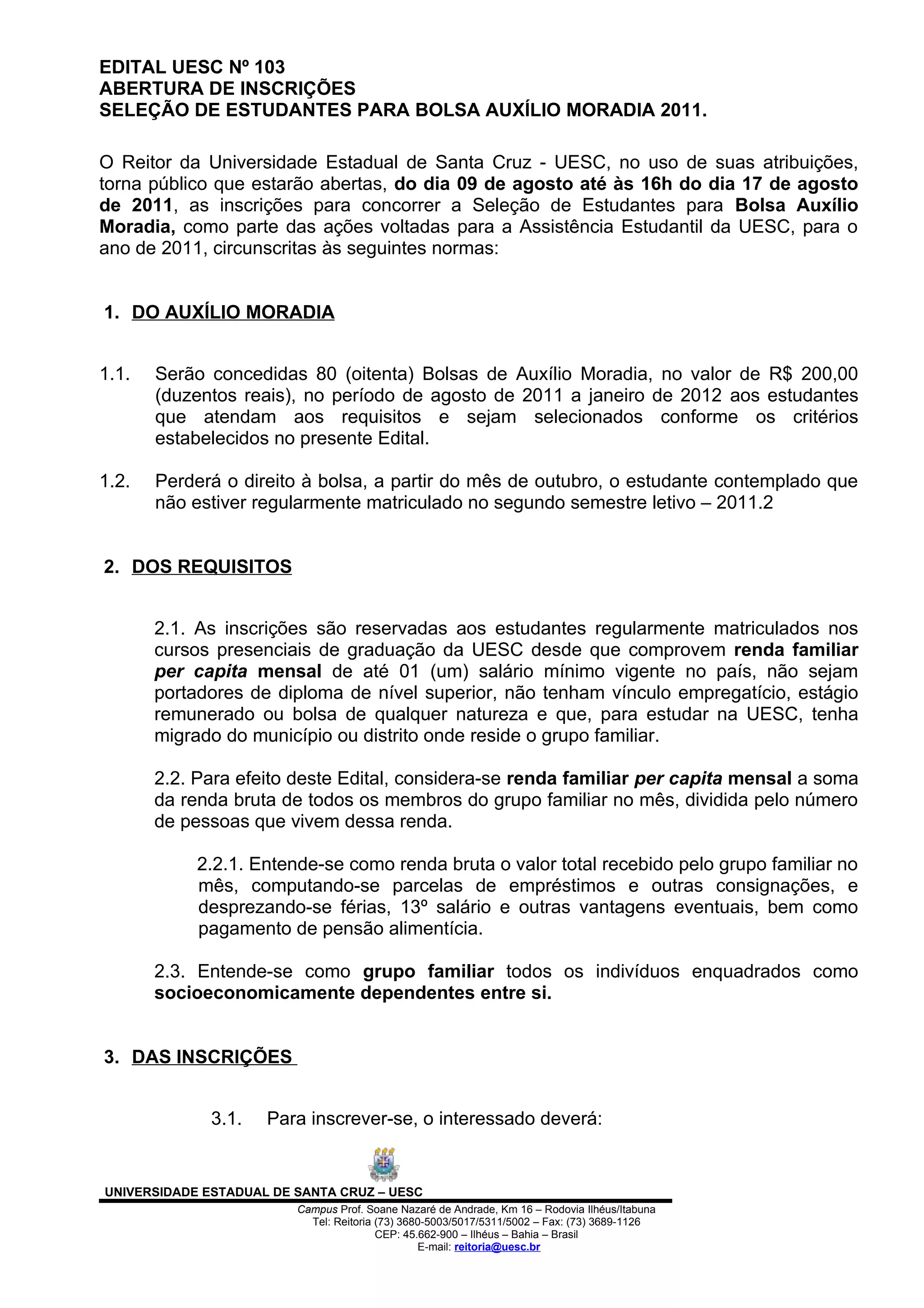 Este edital abre inscrições para 80 bolsas de auxílio moradia no valor de R$200,00 para estudantes da UESC entre agosto de 2011 e janeiro de 2012. Os requisitos incluem renda familiar de até um salário mínimo e comprovante de residência distante do local de origem da família. Os candidatos devem preencher questionário online e entregar documentos comprobatórios de renda e situação familiar entre 9 e 17 de agosto. A seleção dará prioridade a estudantes portadores de deficiência.