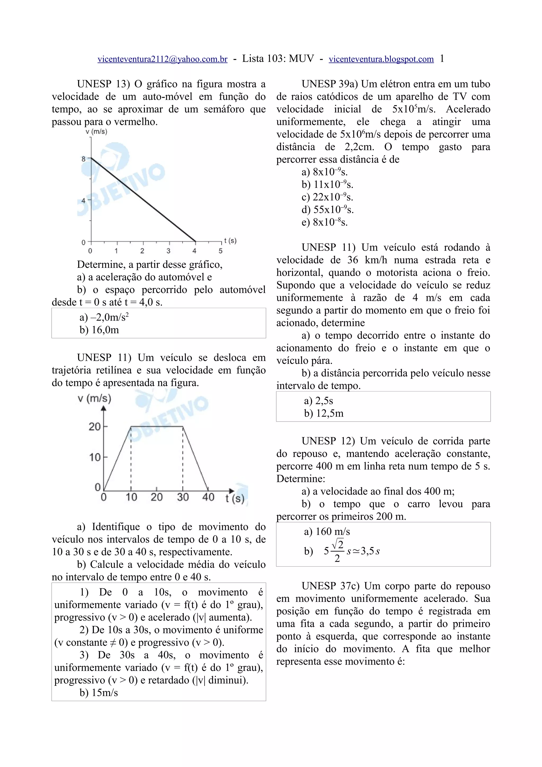 O documento apresenta vários problemas de física relacionados a movimento retilíneo uniforme e uniformemente variado, como velocidade, aceleração e espaço percorrido. Os problemas envolvem situações como movimento de carros, elevadores e outros veículos.
