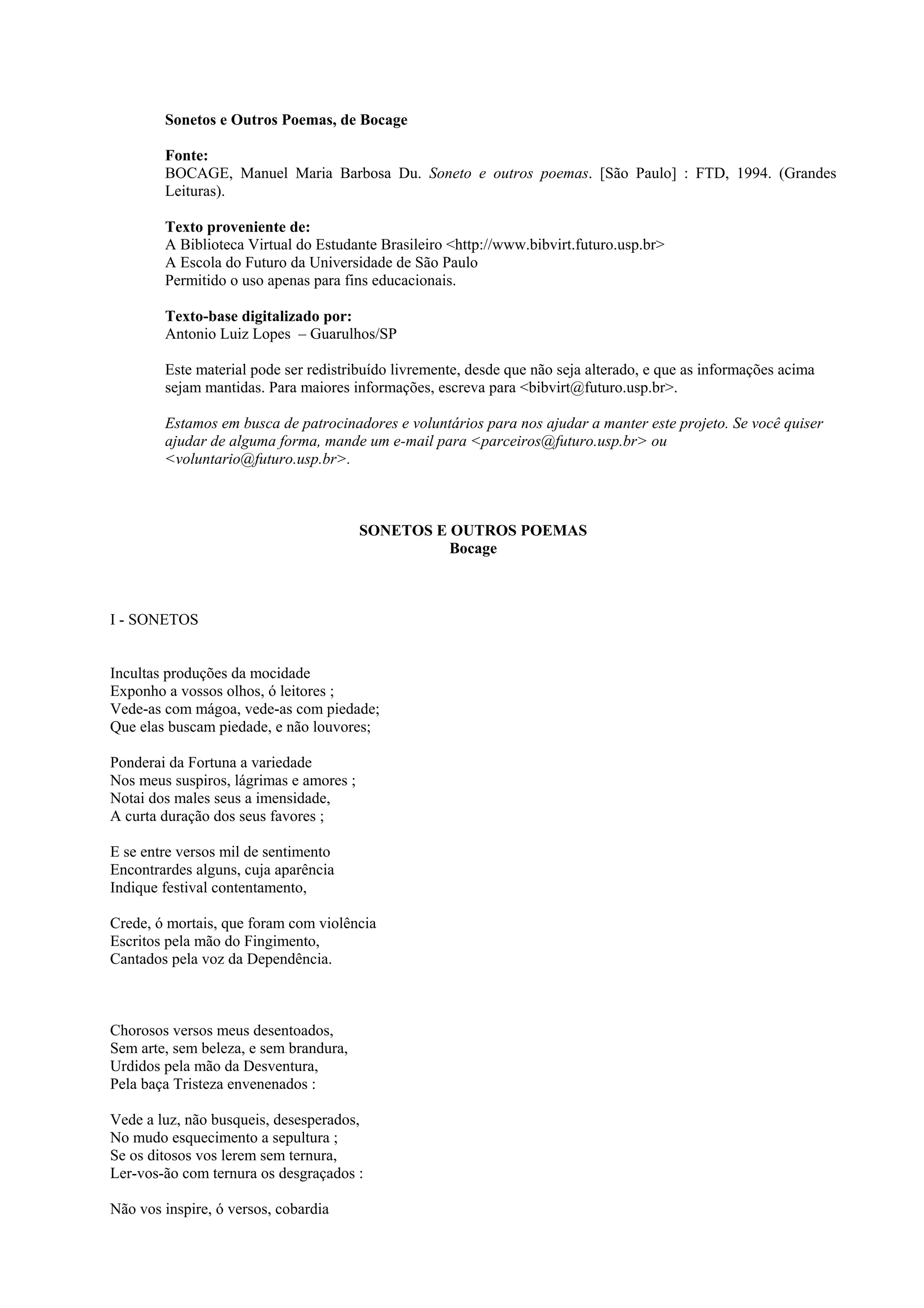 Este documento é uma coleção de poemas do autor português Manuel Maria Barbosa Du Bocage, intitulada "Sonetos e Outros Poemas". O texto foi digitalizado por Antonio Luiz Lopes e disponibilizado no site "A Biblioteca Virtual do Estudante Brasileiro" para fins educacionais. A coleção contém vários poemas de amor e desilusão amorosa escritos em diferentes formas poéticas como sonetos.