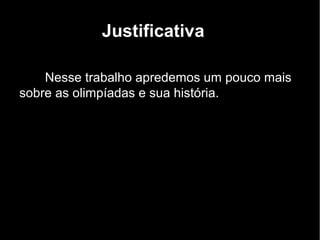 Este documento discute a história das Olimpíadas desde sua origem na Grécia Antiga até os jogos modernos de Londres 2012, incluindo os esportes disputados e os países com mais medalhas na primeira edição dos jogos em Atenas.
