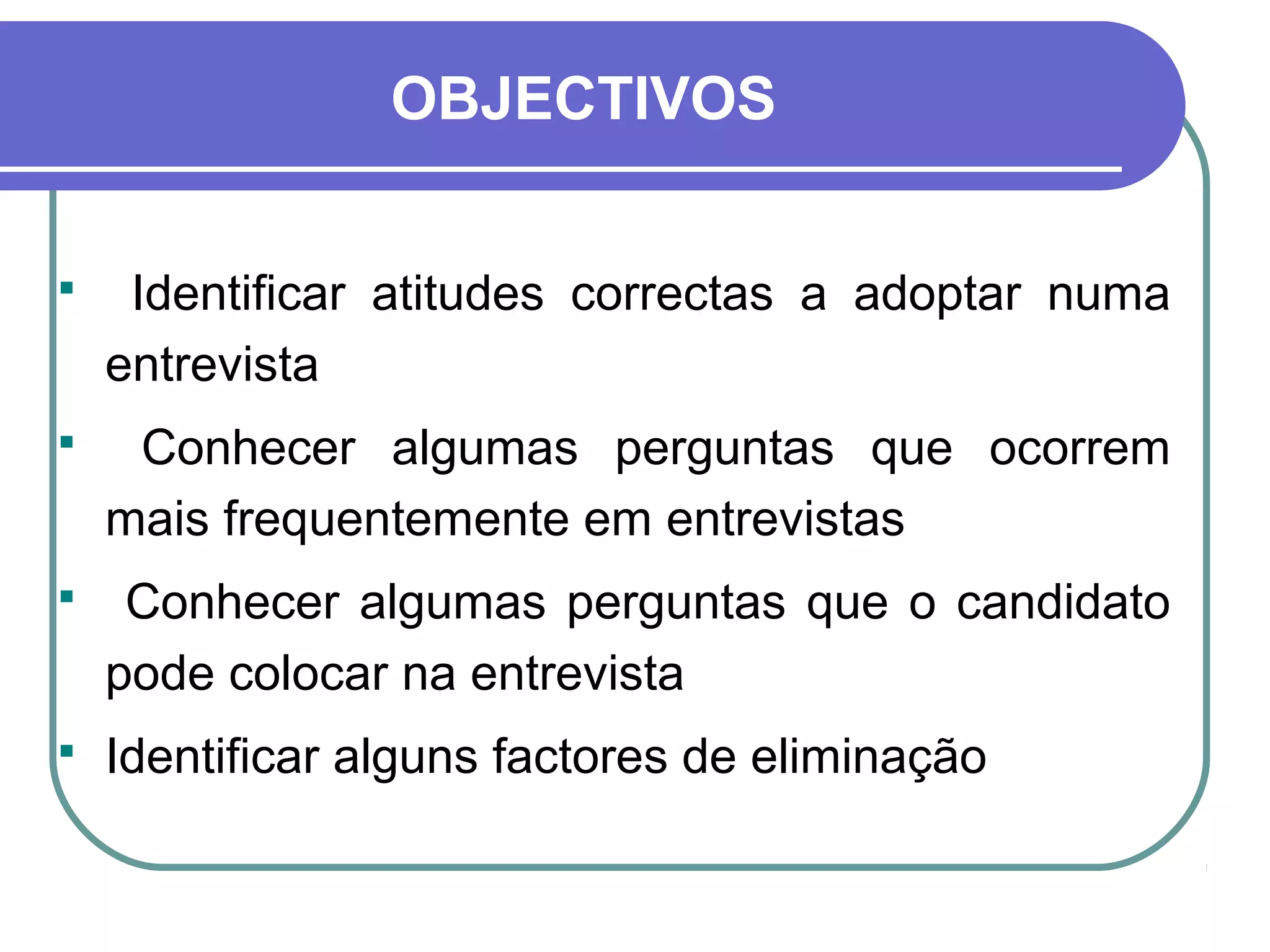 Este documento fornece orientações sobre como se preparar e comportar durante uma entrevista de emprego, identificando atitudes positivas e negativas, perguntas comuns, e fatores que podem levar à eliminação do candidato. O objetivo é ajudar o candidato a se apresentar da melhor maneira e aumentar suas chances de sucesso.