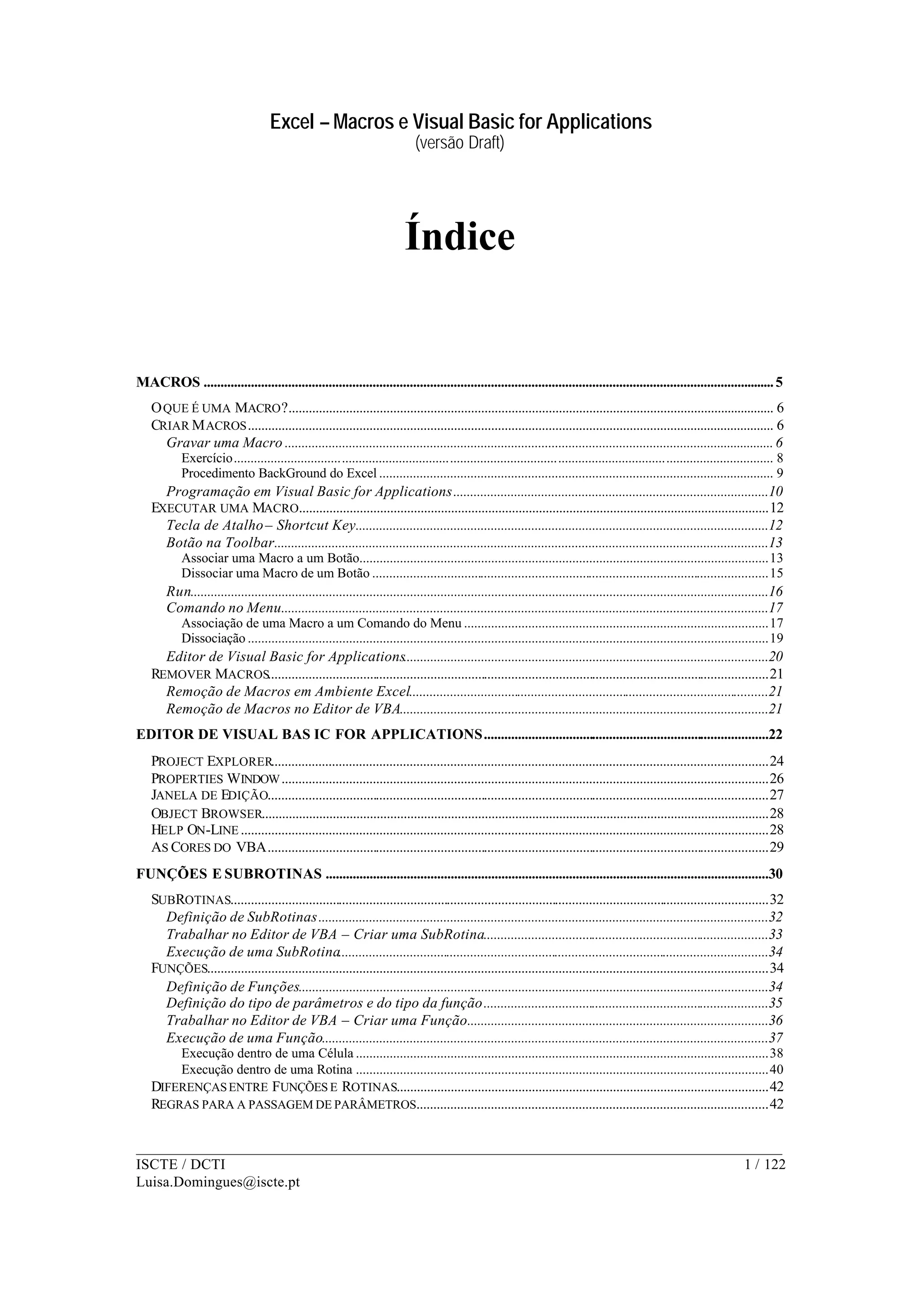 Este documento fornece uma introdução às macros e programação Visual Basic for Applications no Excel. Explica como gravar, executar e associar macros, e como usar o editor VBA para criar subrotinas e funções. Também discute conceitos importantes como variáveis, tipos de dados, passagem de parâmetros e estruturas de dados personalizadas.